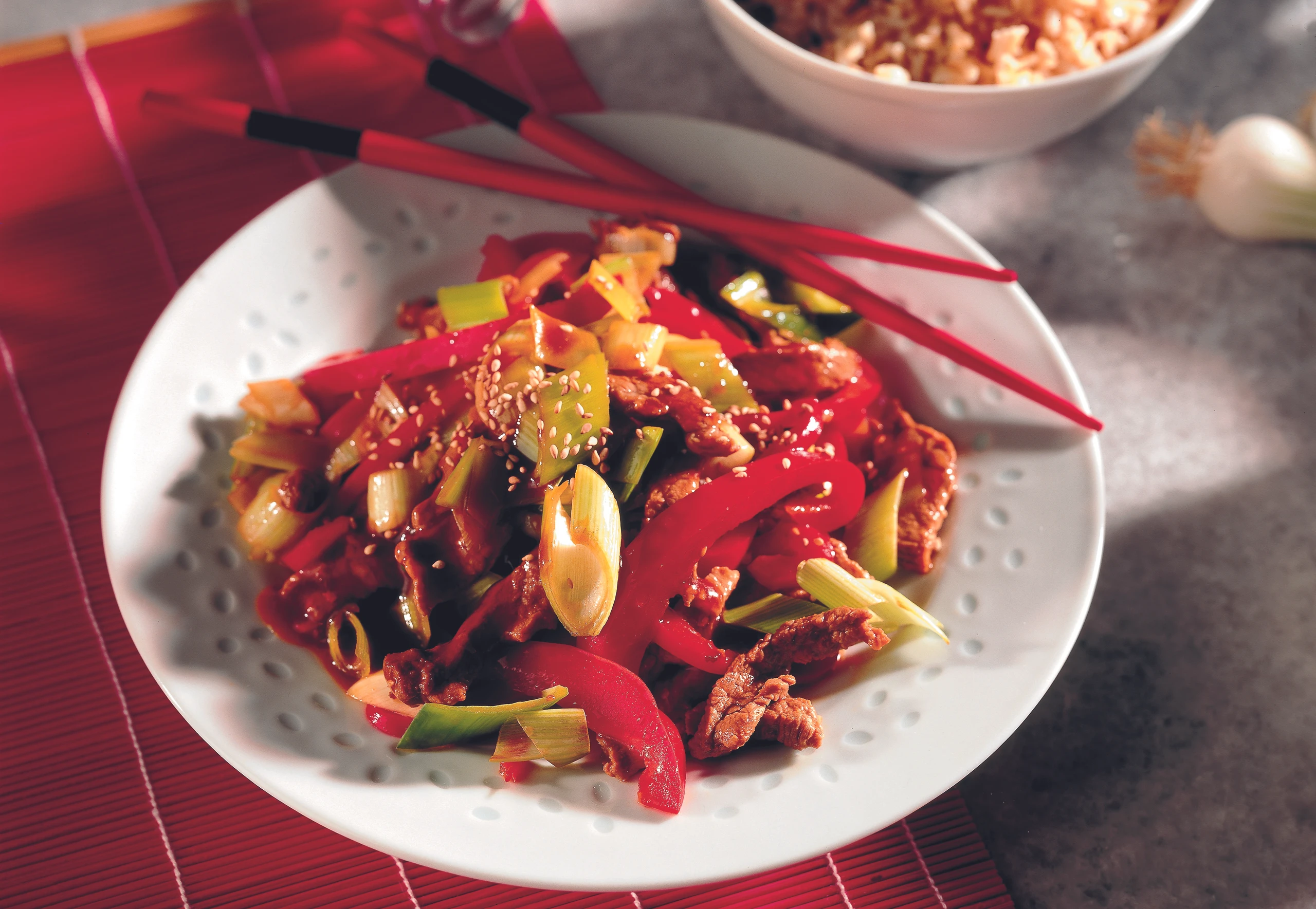 Rindfleisch mit Paprika, Porree und Sesam