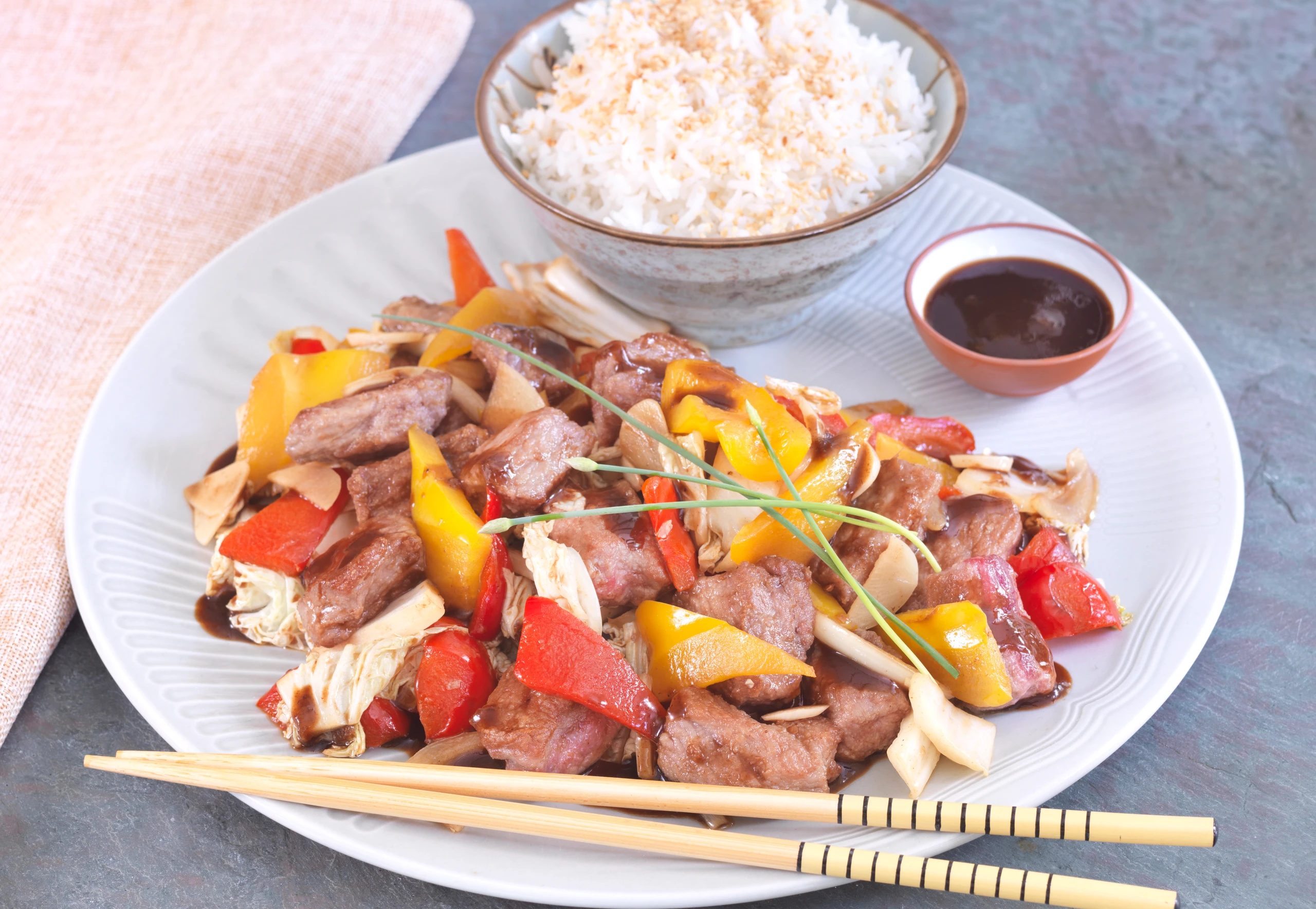 - Im Bratrückstand Gemüse unter Rühren ca. 3 Minuten braten. Fleisch und die Hälfte der Sauce zugeben, kurz aufkochen, mit Salz und Pfeffer abschmecken. Fleischpfanne anrichten, mit Sesamreis servieren. Restliche Sauce dazu reichen.