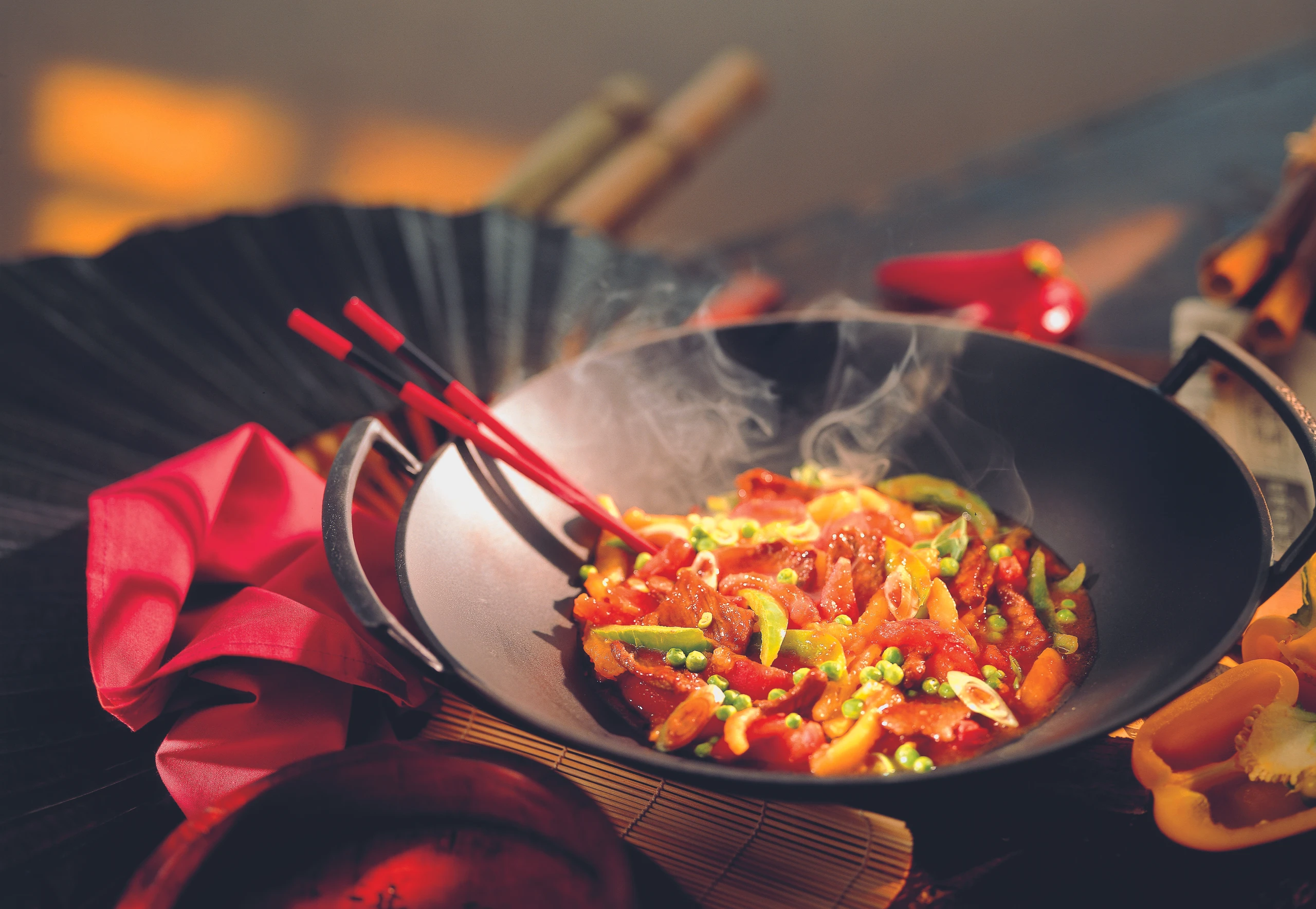 - Übrige 2 EL Öl im Wok erhitzen, Knoblauch und Paprika darin unter Rühren ca. 2 Minuten braten. Paradeiser zugeben und ca. 3 Minuten mitgaren (sie dürfen nicht zerfallen). Fleisch und Erbsen zugeben, ca. 2 Minuten erhitzen und mit einer Prise Chili würzen.