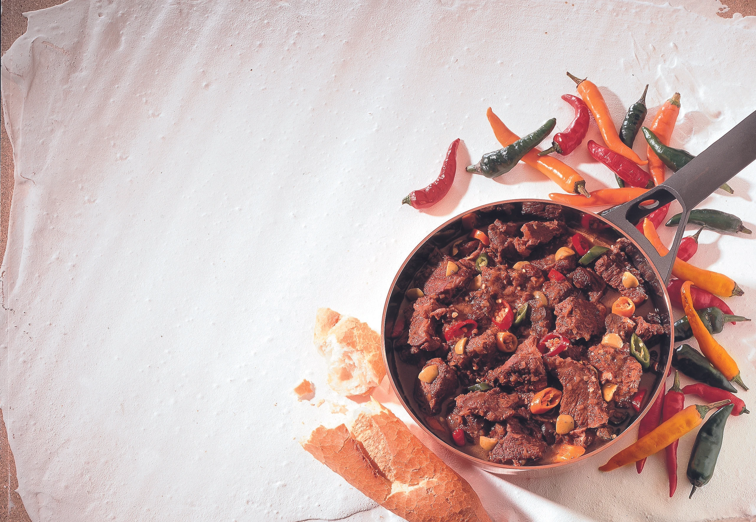 Fleisch, Lorbeerblatt und Pfefferoni in die Zwiebelsauce geben und mit Salz, Pfeffer und Kümmel würzen. Suppe zugießen und den Eintopf auf ganz kleiner Flamme 2 1/2–3 Stunden langsam weichköcheln.