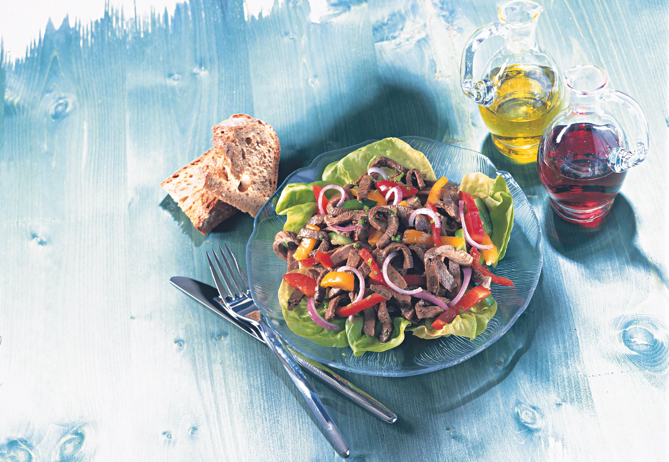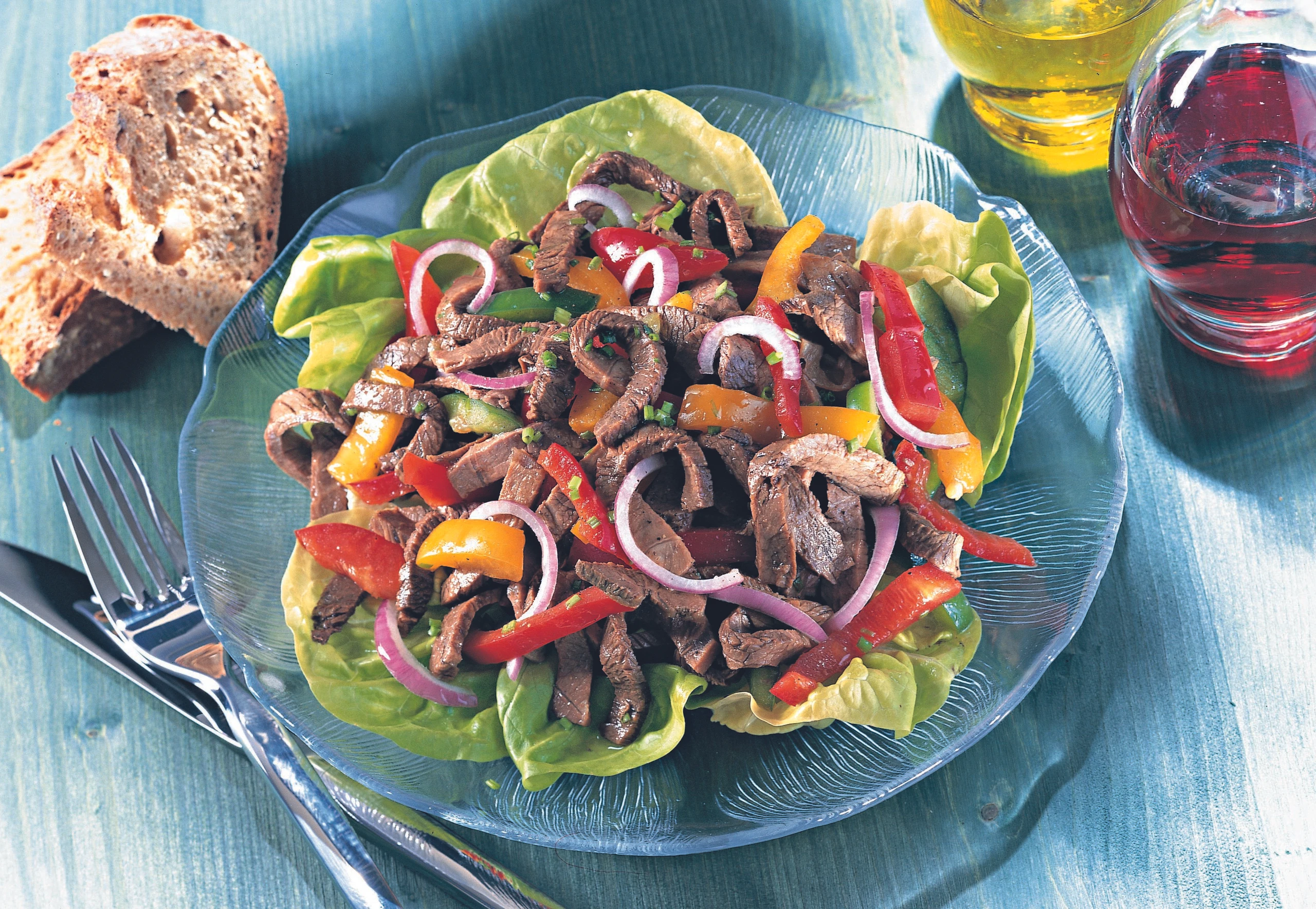 Rindfleisch, Paprika und Zwiebel behutsam mit der Marinade vermischen und ca. 1/4 Stunde ziehen lassen. Salat auf gekühlten Tellern anrichten. Dazu serviert man am besten Schwarzbrot.