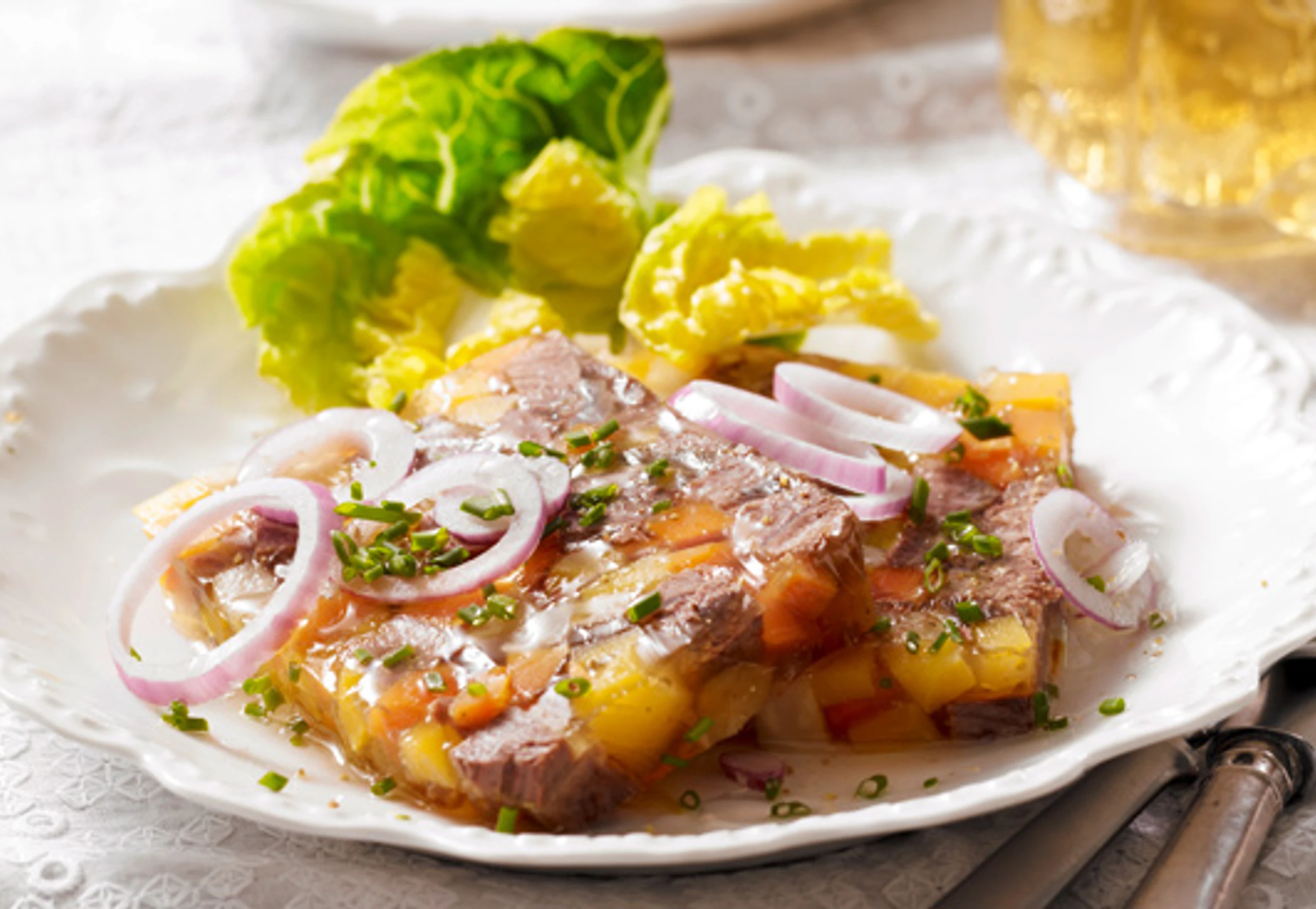 - Für die Marinade Zwiebeln schälen und in Ringe schneiden. Essig, 80 ml von der Rindsuppe, Salz, Pfeffer und Öl verrühren, Zwiebeln untermischen. Sulz portionieren, mit der Marinade anrichten und eventuell mit Blattsalaten garnieren.
