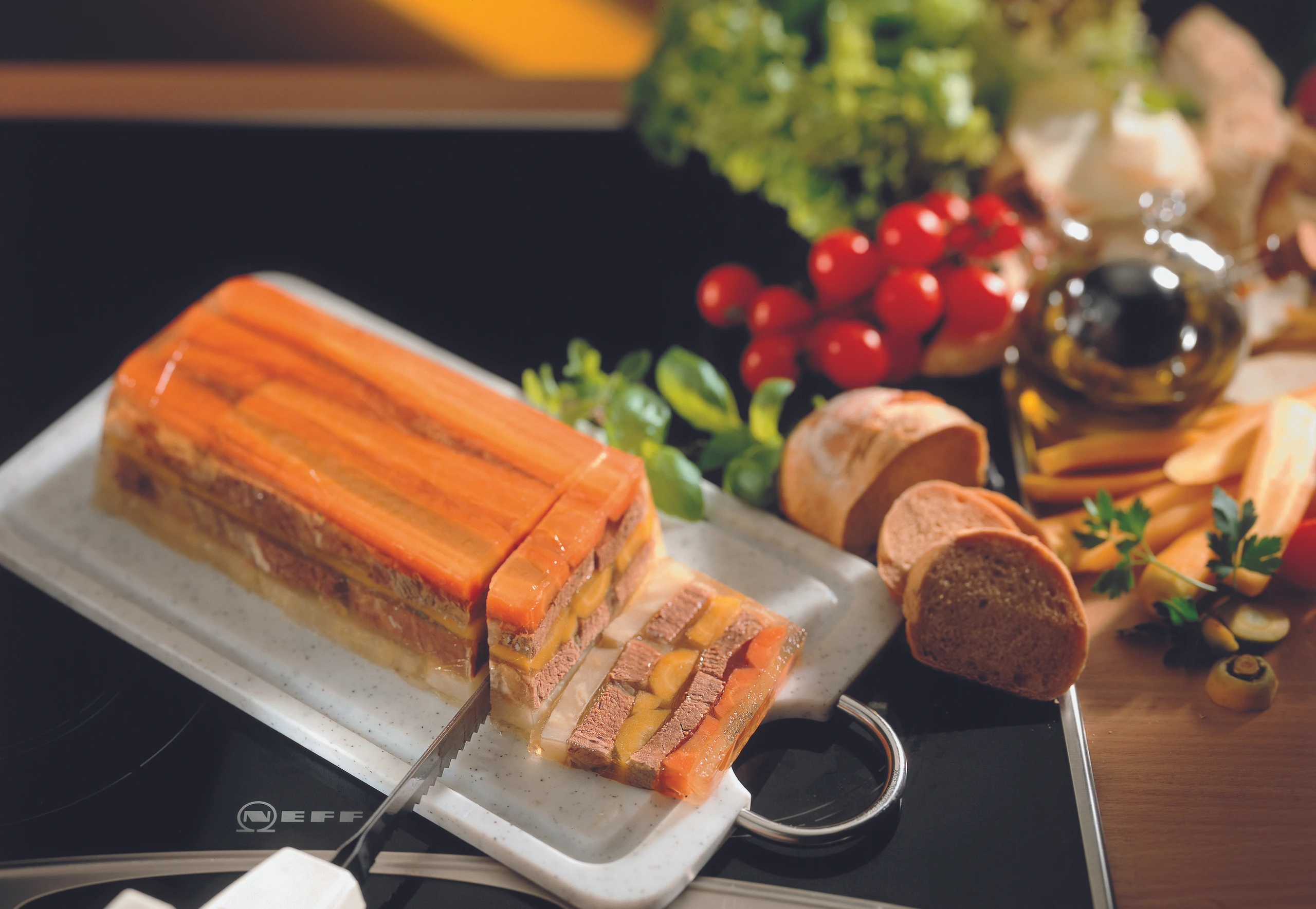 Gemüse schälen und in Salzwasser gut weich kochen. Gemüse mit einem Siebschöpfer herausheben, kalt abschrecken und gut abtropfen lassen. Fleisch quer zur Faser, Gemüse der Länge nach in 1 cm dicke Scheiben schneiden. Gelatine in kaltem Wasser einweichen. Suppe erhitzen und mit Salz, Pfeffer, Muskatnuss und 1 EL Essig würzen. Gelatine gut ausdrücken und in der Suppe auflösen. Suppe auf Raumtemperatur abkühlen lassen, ca. 1/2 cm hoch in die Form gießen und im Kühlschrank stocken lassen (ca. 15 Minuten).