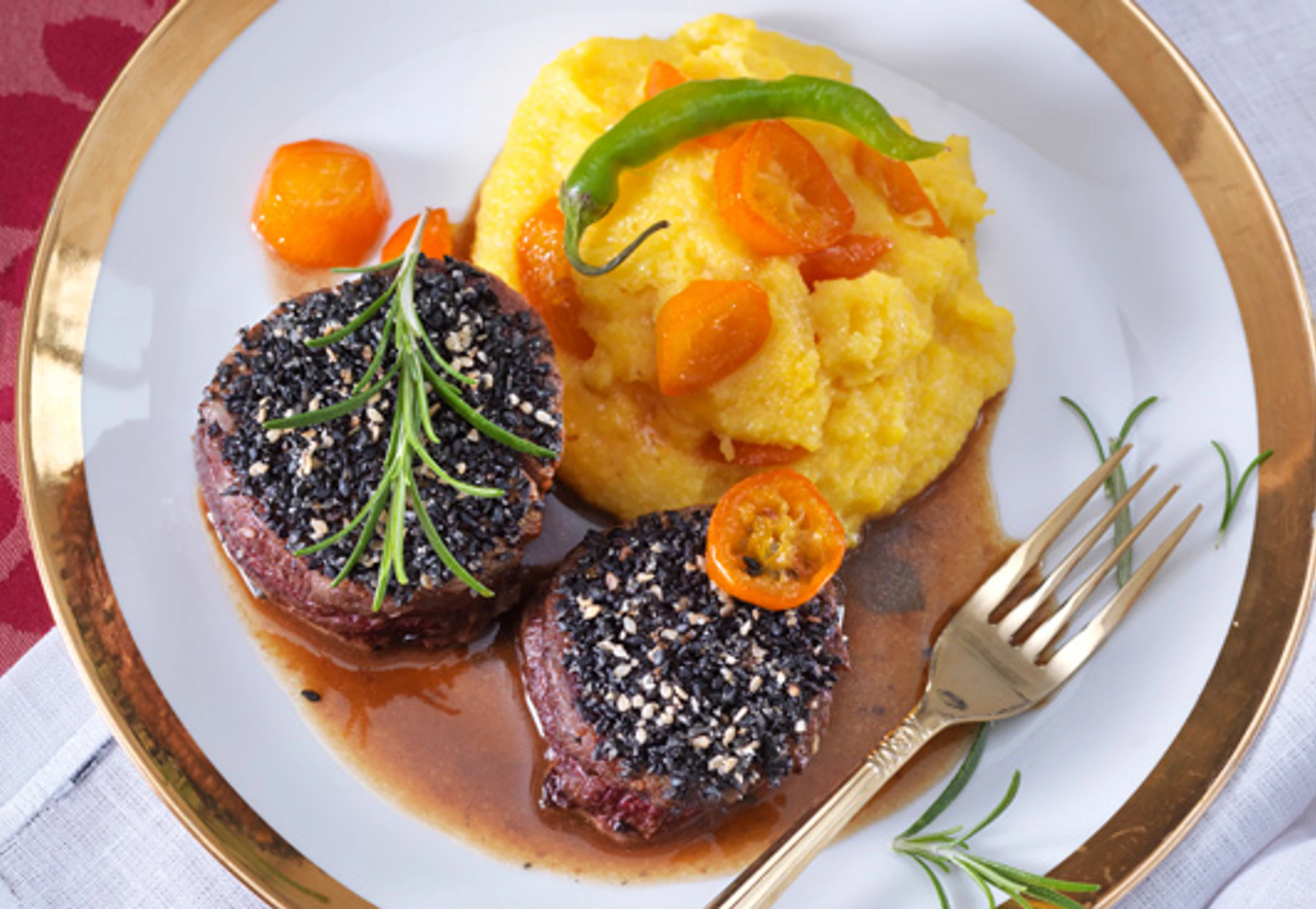 - Rohr auf 60°C vorheizen. Eine Auflaufform mit Butter ausstreichen und ins Rohr (untere Schiene / Gitterrost) stellen. Sesam in einem Kutter fein pürieren und mit den Salzflocken vermischen. Medaillons ein wenig flachdrücken und im Öl beidseitig braten (gesamt ca. 7 Minuten); nach halber Garzeit Rosmarin zugeben. Fleisch in die Auflaufform setzen, mit der Sesam-Salzmischung bestreuen und im Rohr ca. 30 Minuten rasten lassen. Bratrückstand mit Jus aufgießen und aufkochen.