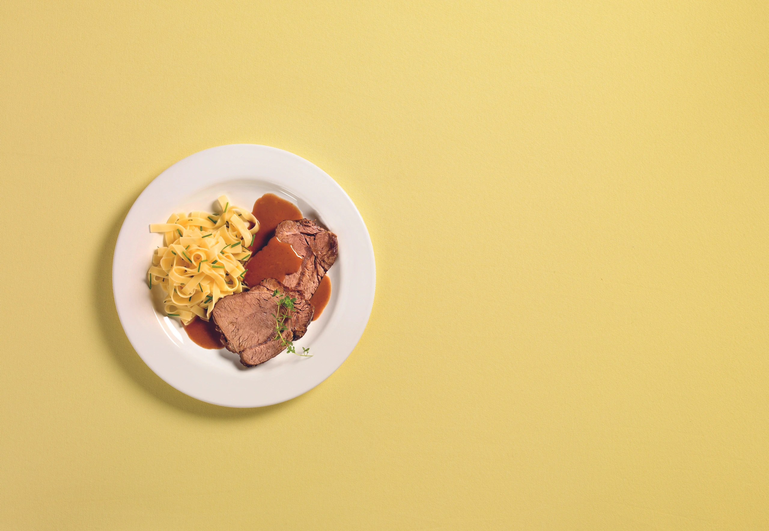 - Fleisch herausnehmen, in Alufolie wickeln und warmstellen. Sauce abseihen und auf 500 ml einkochen. Obers zugießen, Sauce 5 Minuten köcheln. Braten aufschneiden und mit der Sauce anrichten. Dazu passen Bandnudeln.