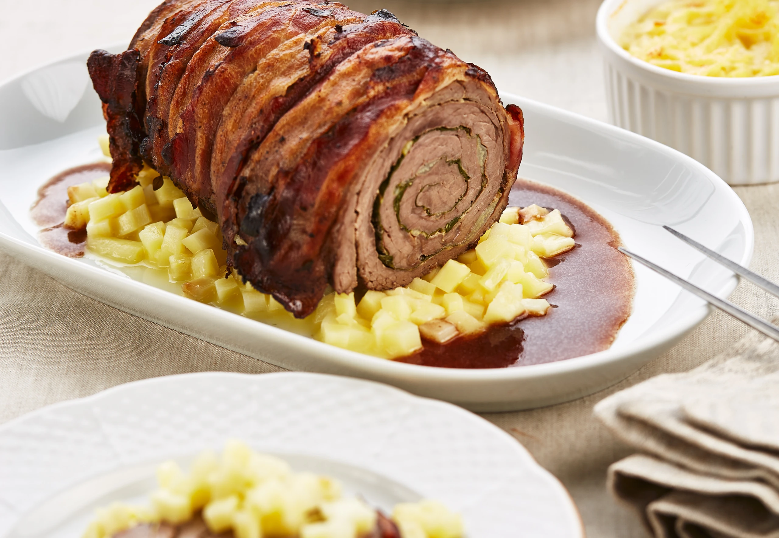 - Fleisch herausnehmen, Spagat entfernen. Fleisch warm stellen. Bratensaft abseihen und aufkochen. Stärke mit Wasser verquirlen, einrühren und ca. 1 Minute köcheln. Fleisch mit Sauce, Aufläufen und Gemüse anrichten.