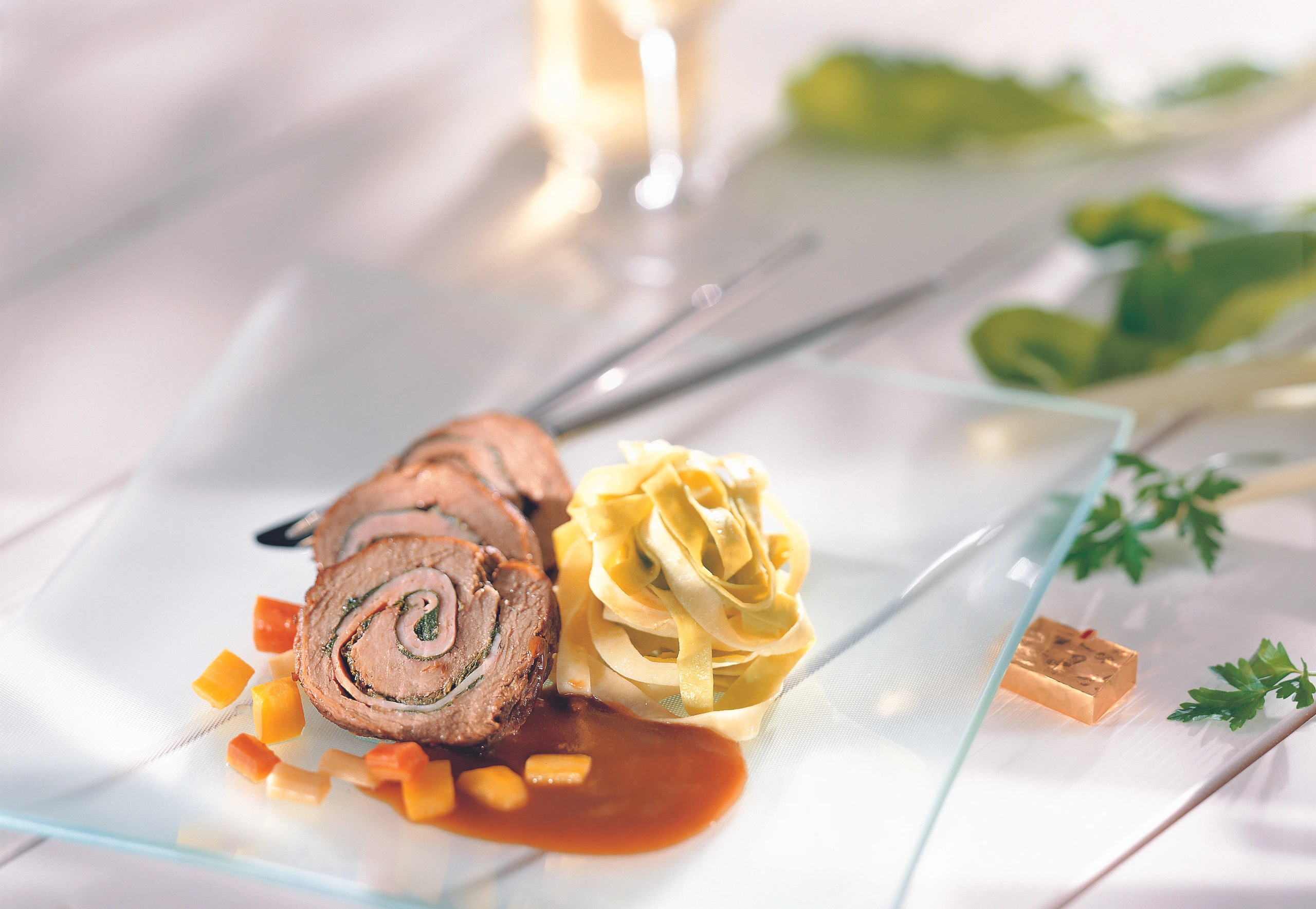 Rindsbraten mit Schinken-Mangoldfülle und Tagliatelle