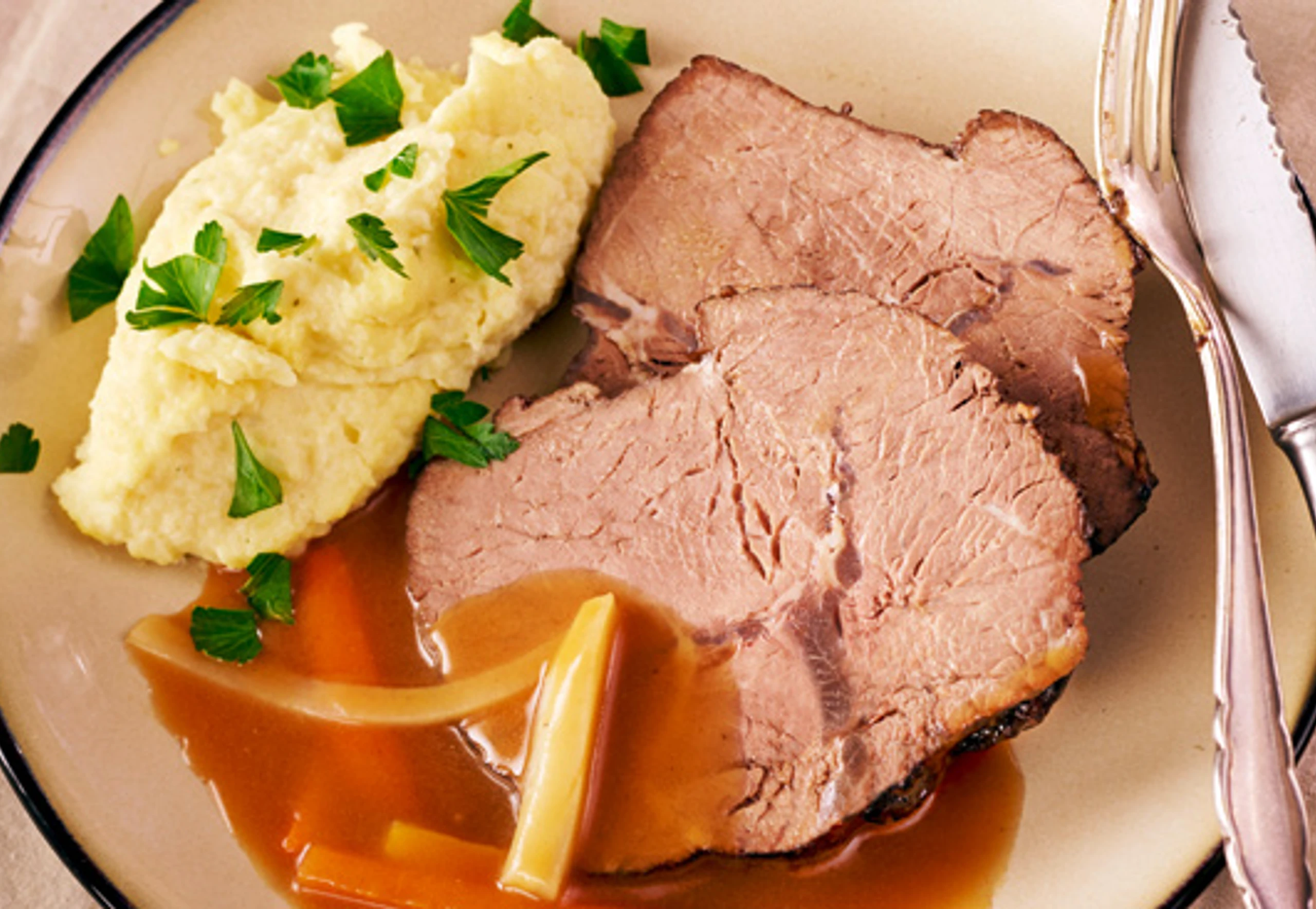 - Fleisch herausnehmen und warm stellen. Sauce abseihen und auf 500 ml einkochen. Obers zugießen, Sauce 5 Minuten köcheln. Gemüse in 1 EL Butter schwenken, mit Salz und Pfeffer würzen. Braten aufschneiden, mit Sauce, Gemüse und Püree anrichten.