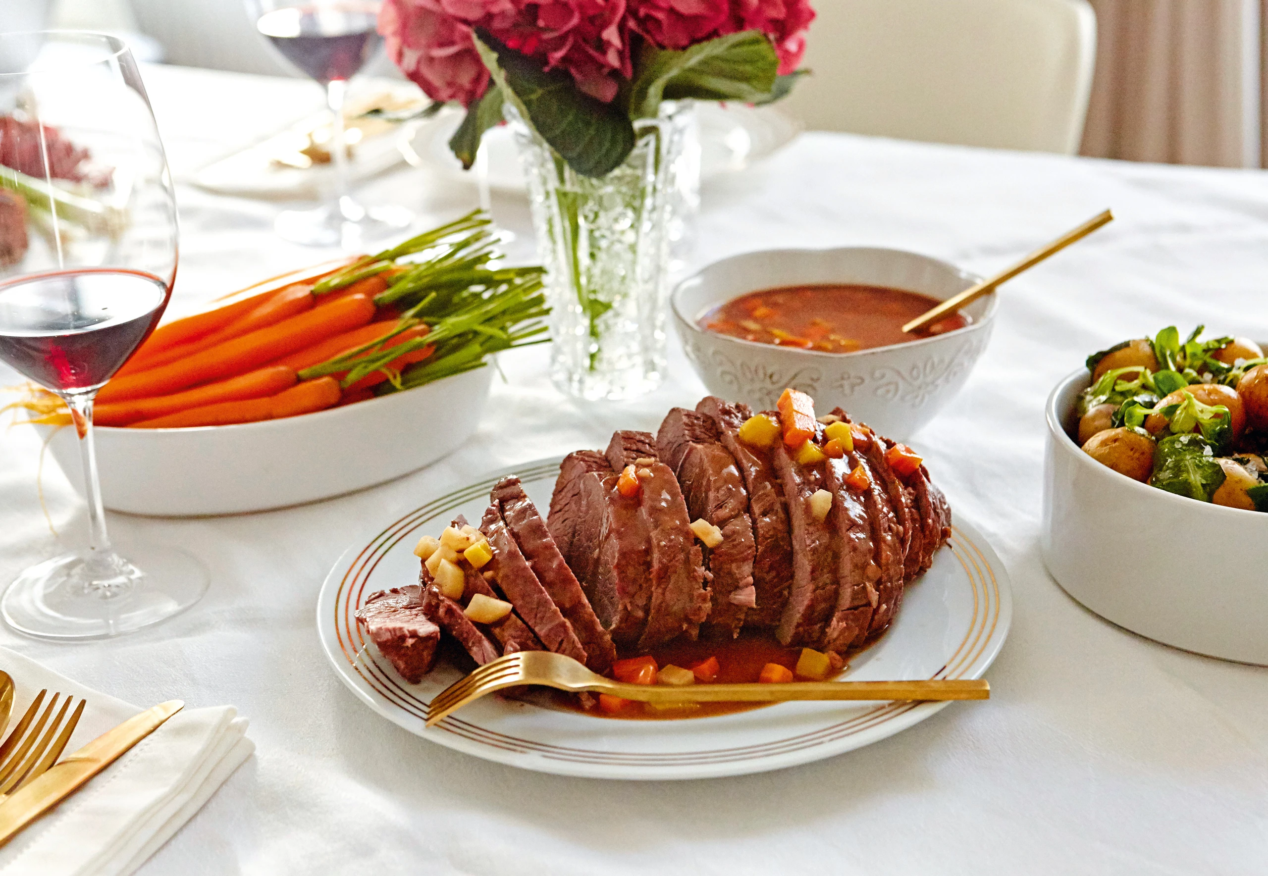 Rindsbraten mit Rahmsauce, Jungkarotten und Erdäpfeln