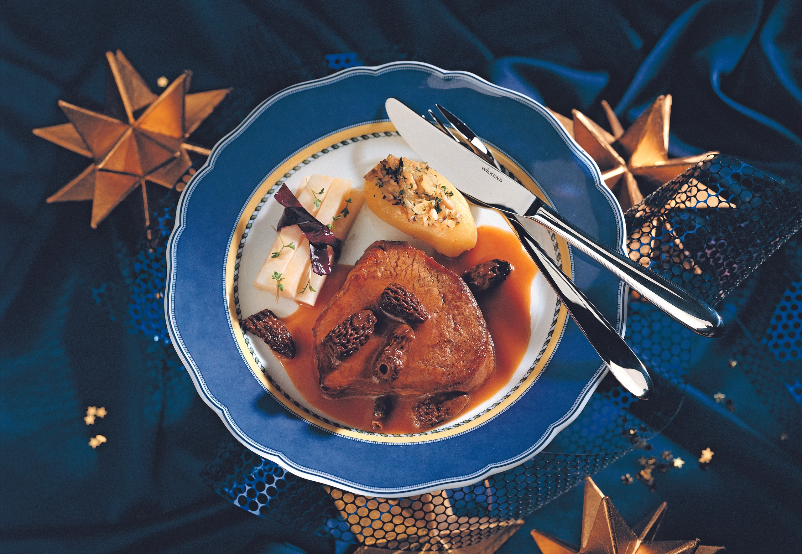 - Im Bratrückstand wenig Butter erhitzen, Zwiebel und Morcheln darin anschwitzen, mit Sherry ablöschen und die Flüssigkeit einkochen. Bratensaft zugießen, kurz köcheln und mit Salz und Pfeffer würzen. Fleisch kurz darin ziehen lassen und mit den Beilagen anrichten.
