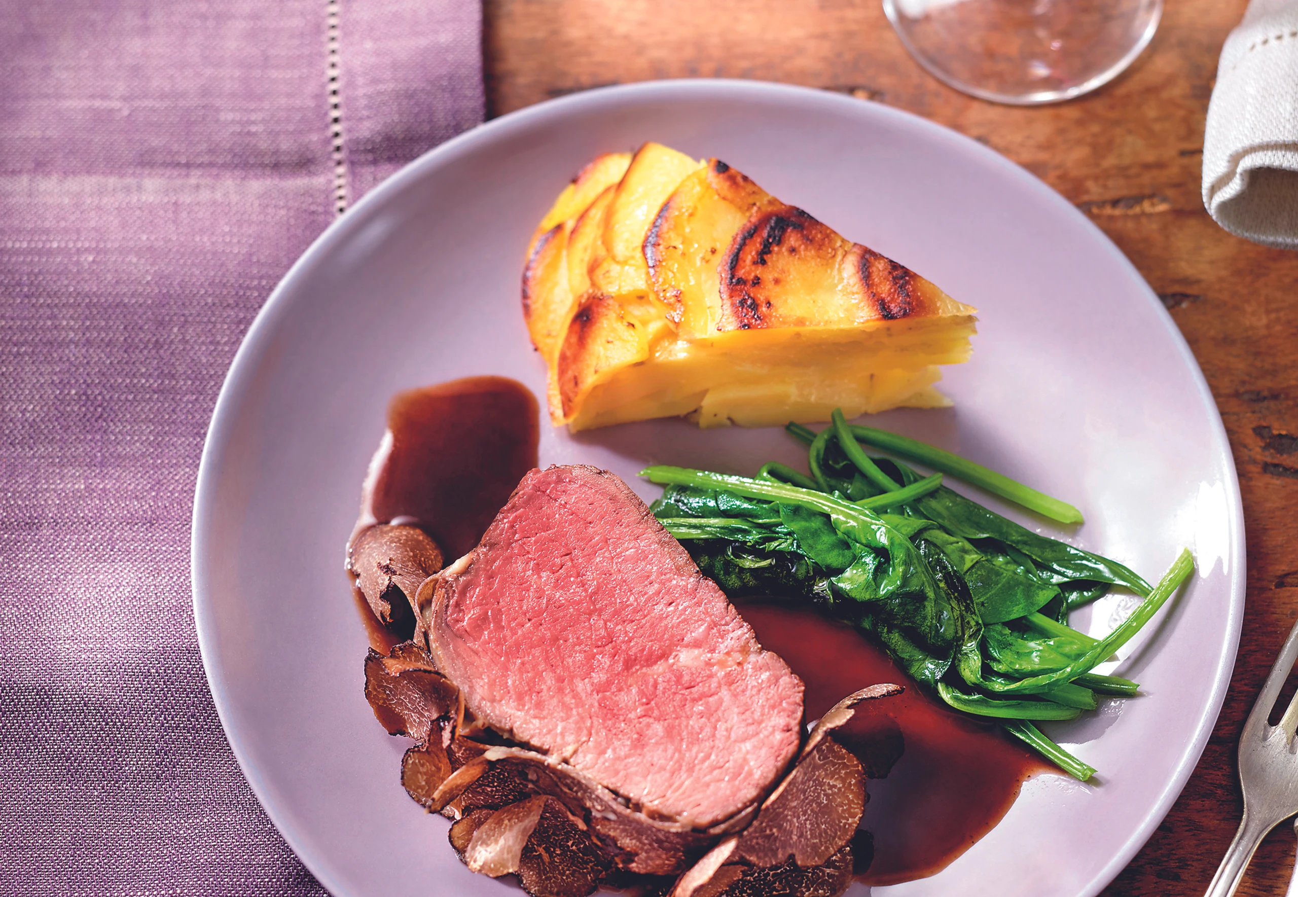 Trüffeln dünn hobeln. Filet mit Trüffeln, Sauce, Spinat und Anna-Erdäpfeln servieren.