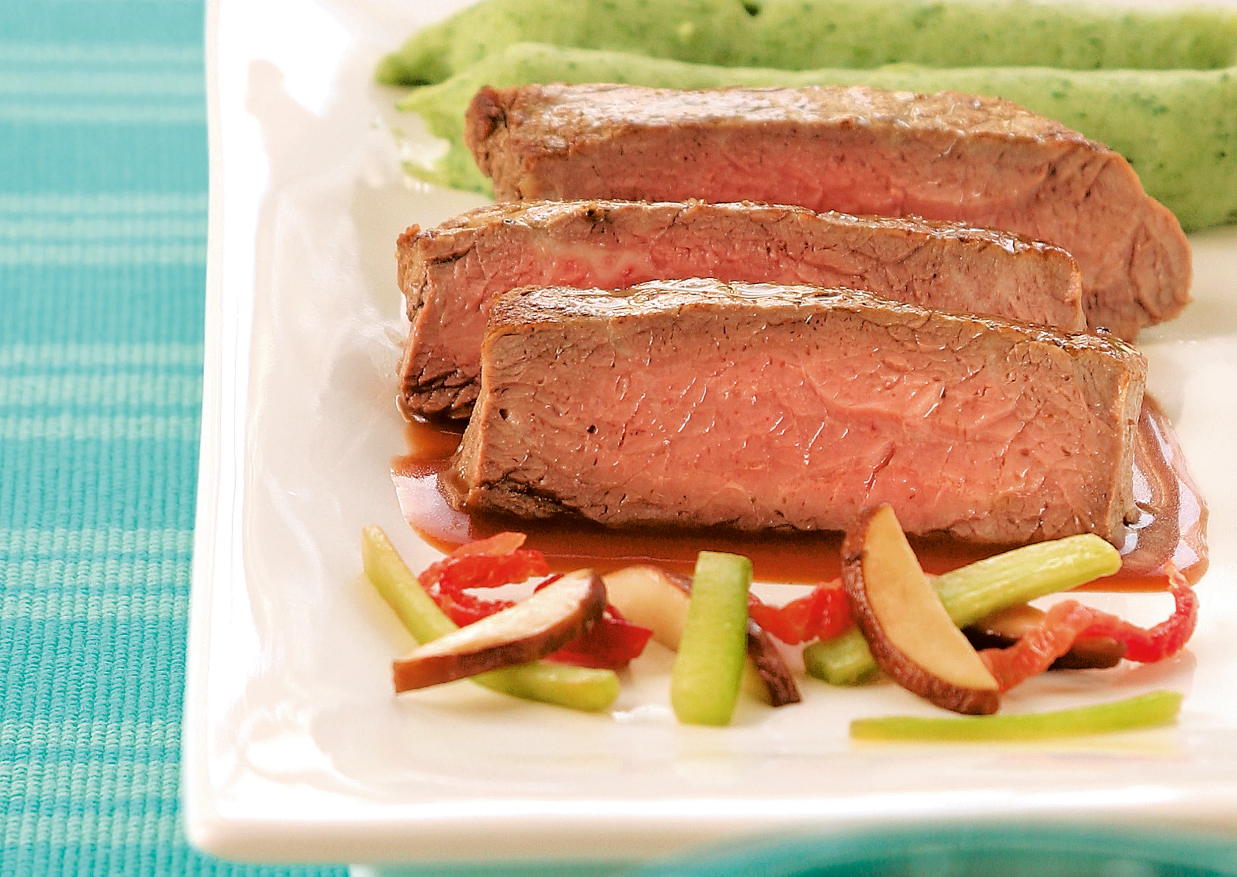 Steaks in Streifen schneiden, mit Sauce, Garnitur und dem Püree servieren.
