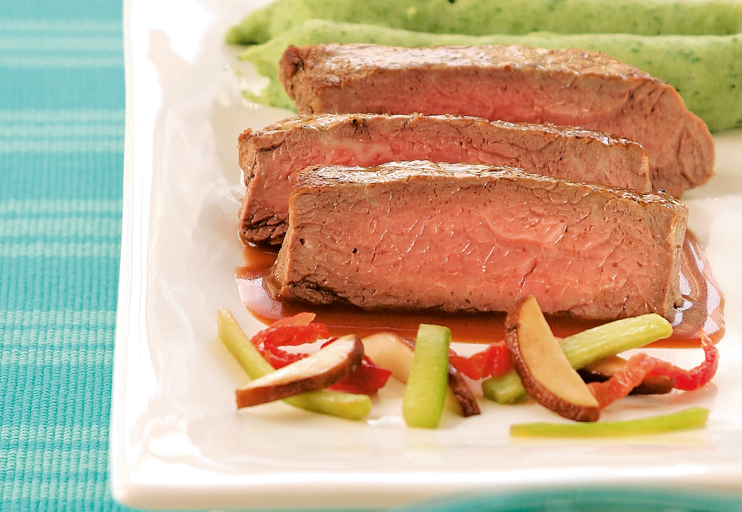 Rindsfiletstreifen mit pikanter Senfsauce und Erdäpfel-Spinatpüree