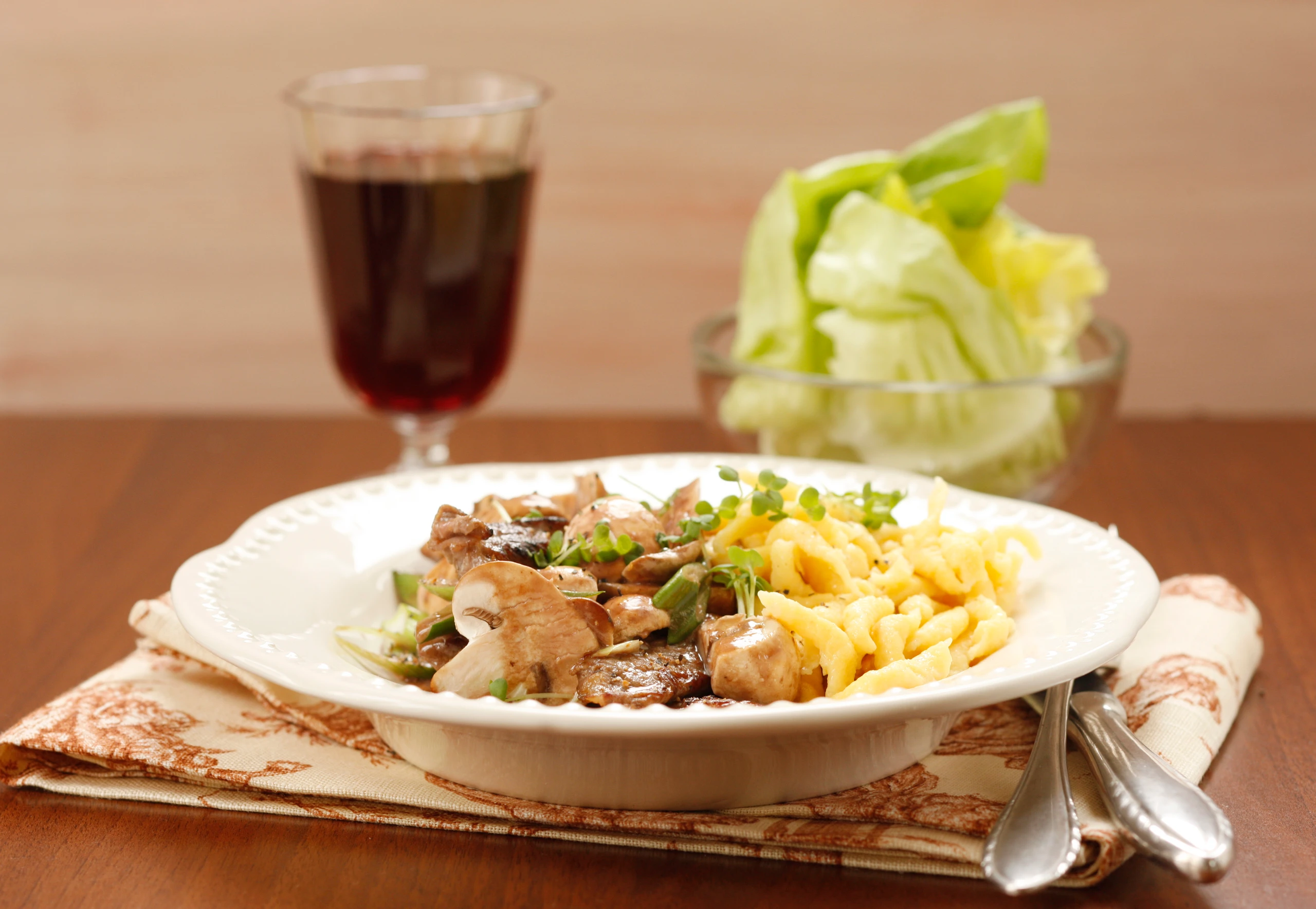 Fleisch untermischen und in der Sauce kurz ziehen lassen. Geschnetzeltes mit Spätzle und Salat anrichten, mit Kresse garniert servieren.