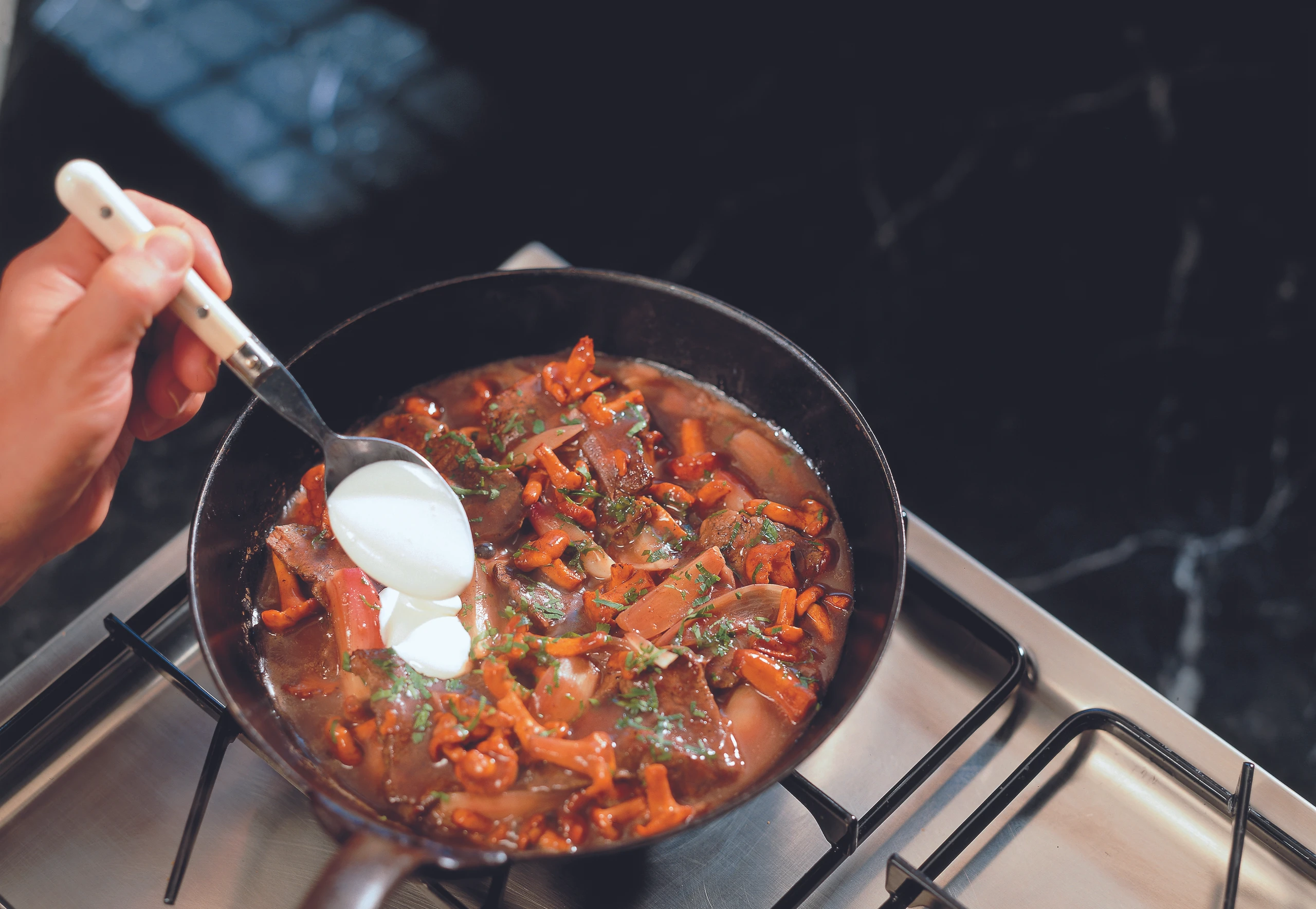 Rindsgeschnetzeltes mit Rotweinschalotten und Eierschwammerln