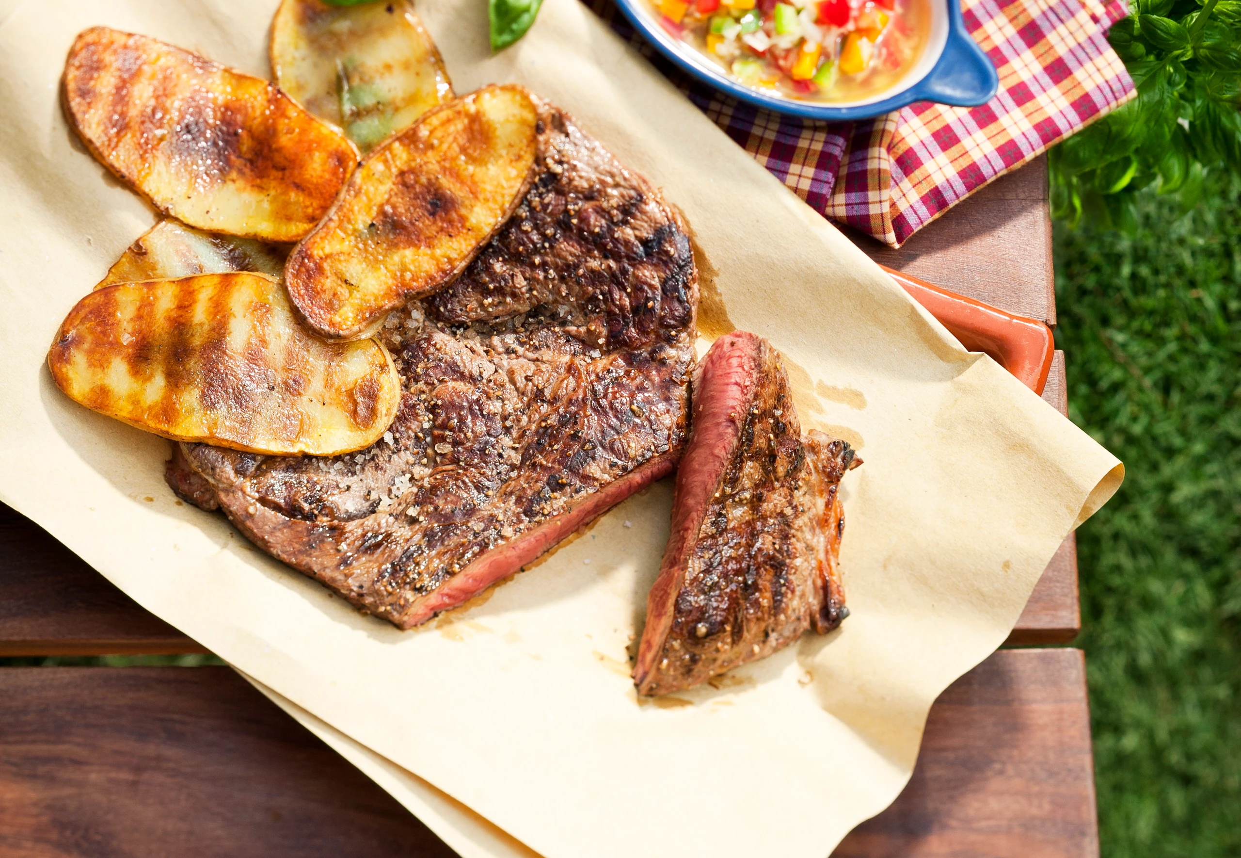 - Fleisch bei starker Hitze auf jeder Seite 3 Minuten grillen. Fleisch an den Rand des Grills legen und langsam fertig garen (ca. 5 Minuten). Parallel dazu Erdäpfel auf den Grill legen und beidseitig knusprig grillen.