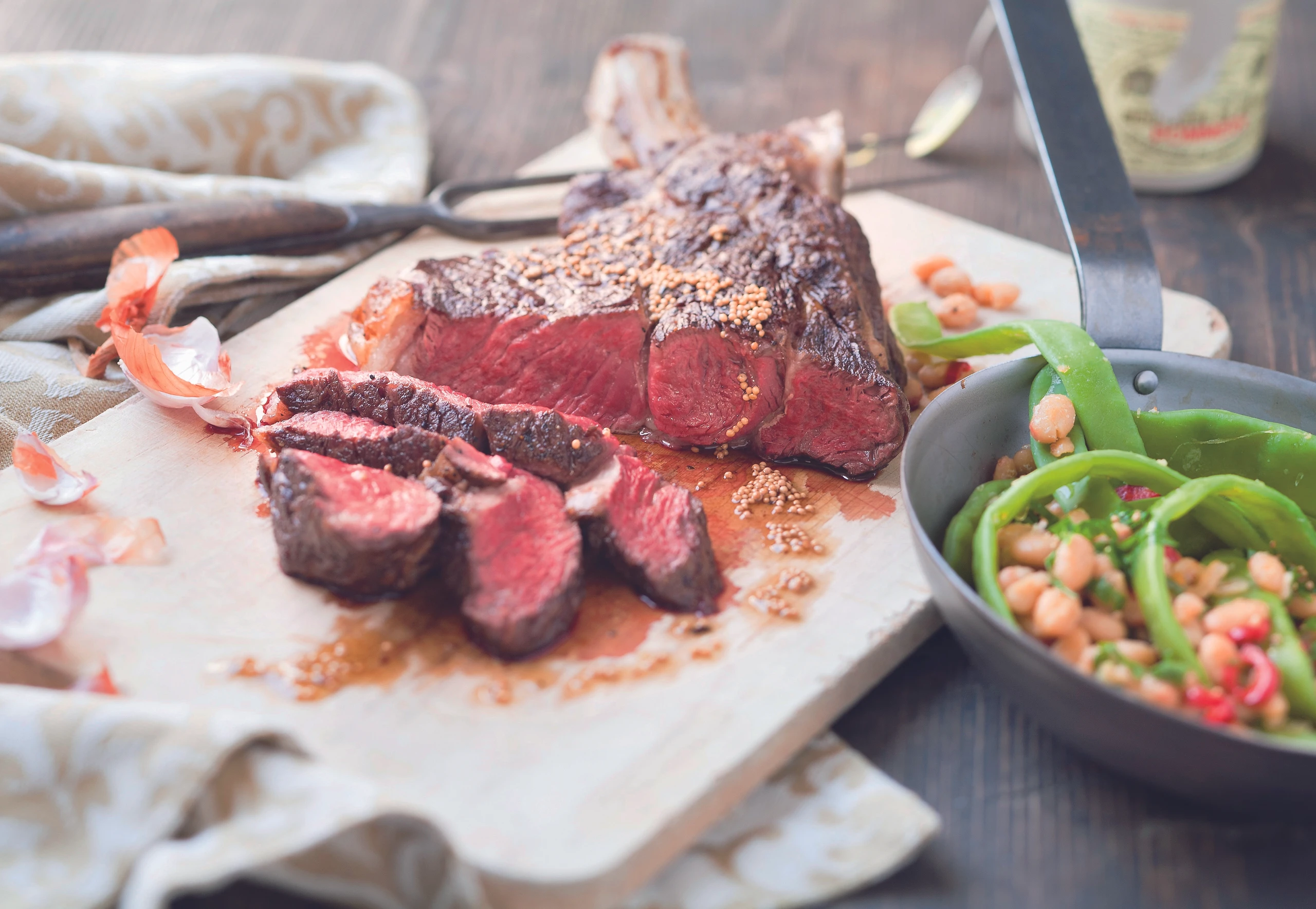 Saftig gegartes Rindskotelett mit Bohnengemüse