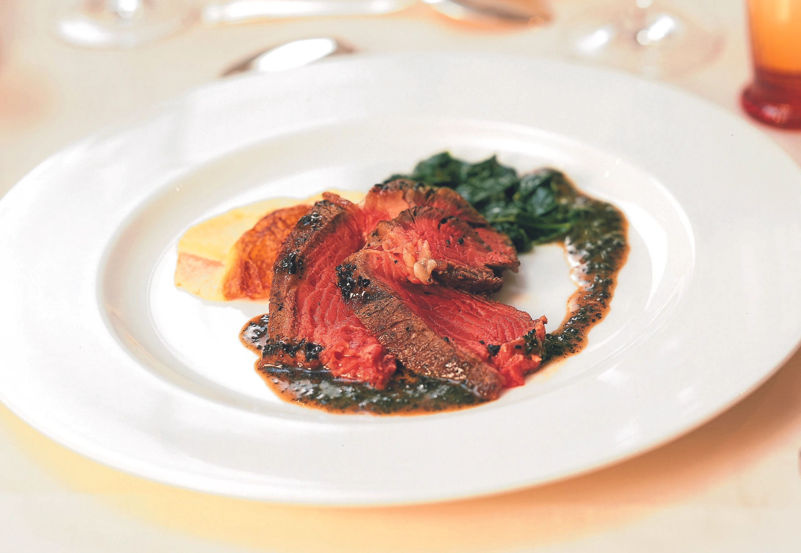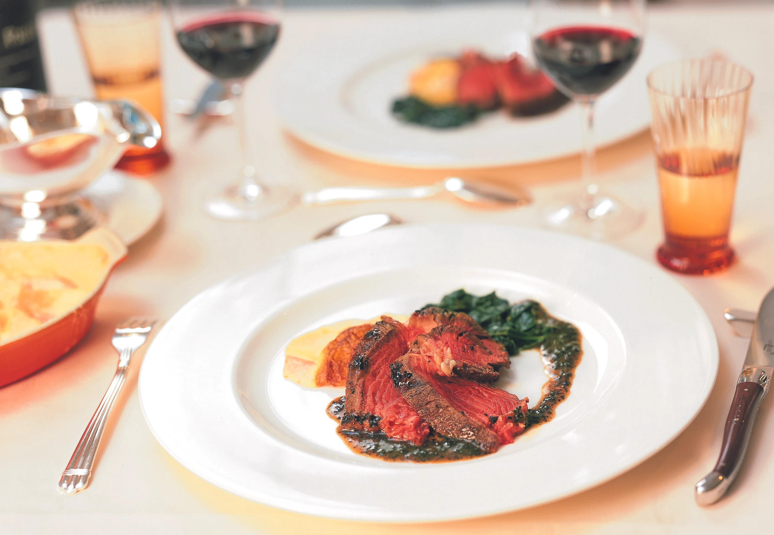 Rindskotelett in Rotwein-Sauce mit Erdäpfel-Kürbis-Gratin