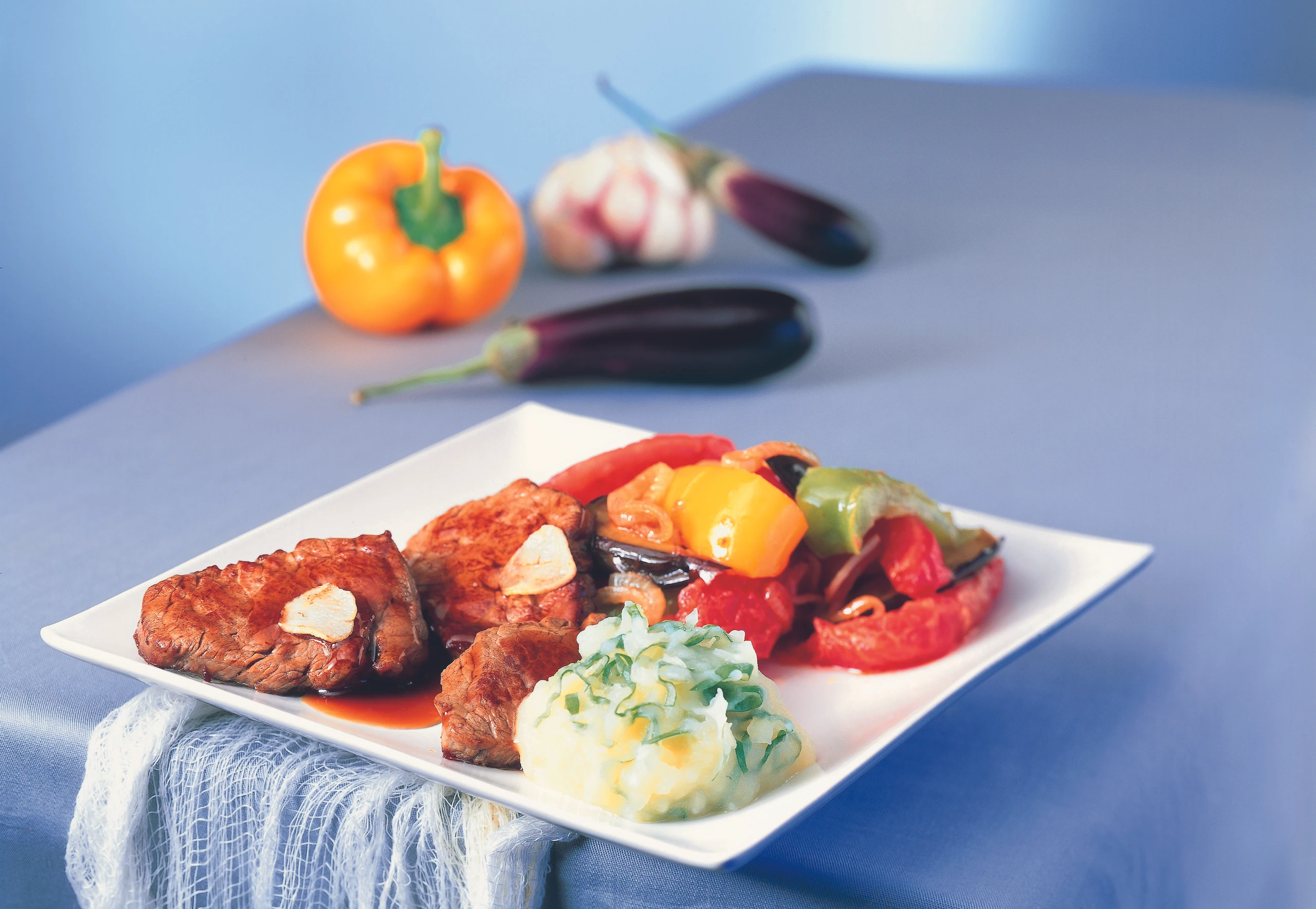 Rindslungenbraten mit Erdäpfel-Basilikum-Creme und Ratatouille