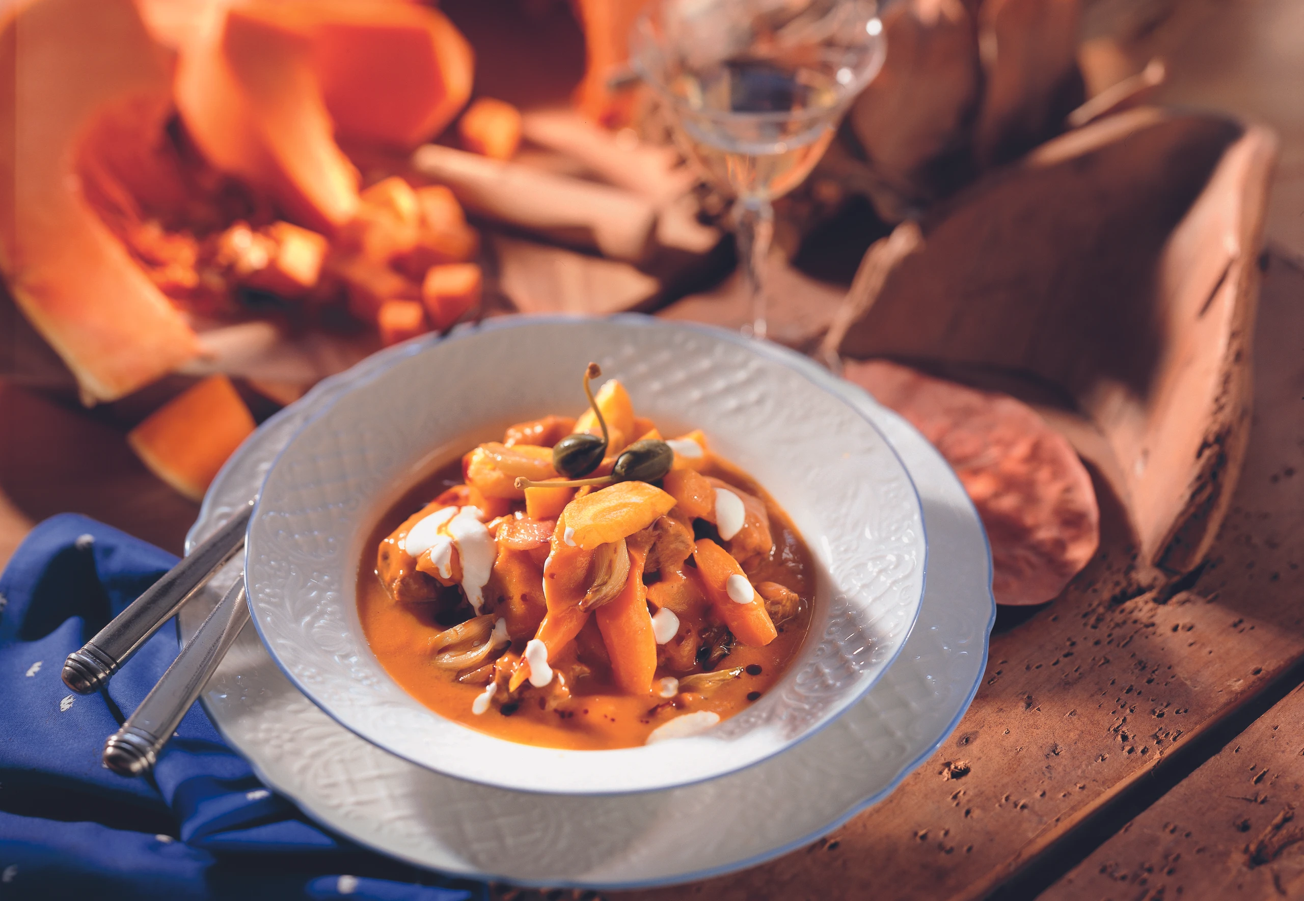 Fleisch in heißem Öl anbraten, herausnehmen und im Bratrückstand Zwiebel unter Rühren anrösten. Kürbis zugeben und kurz mitrösten. Paradeismark einrühren. Mit Wein ablöschen und mit Suppe aufgießen. Sauce mit Salz, Pfeffer, Majoran, Kümmel und zerdrücktem Knoblauch würzen. Fleisch einlegen und zugedeckt bei schwacher Hitze ca. 1 Stunde weich dünsten.