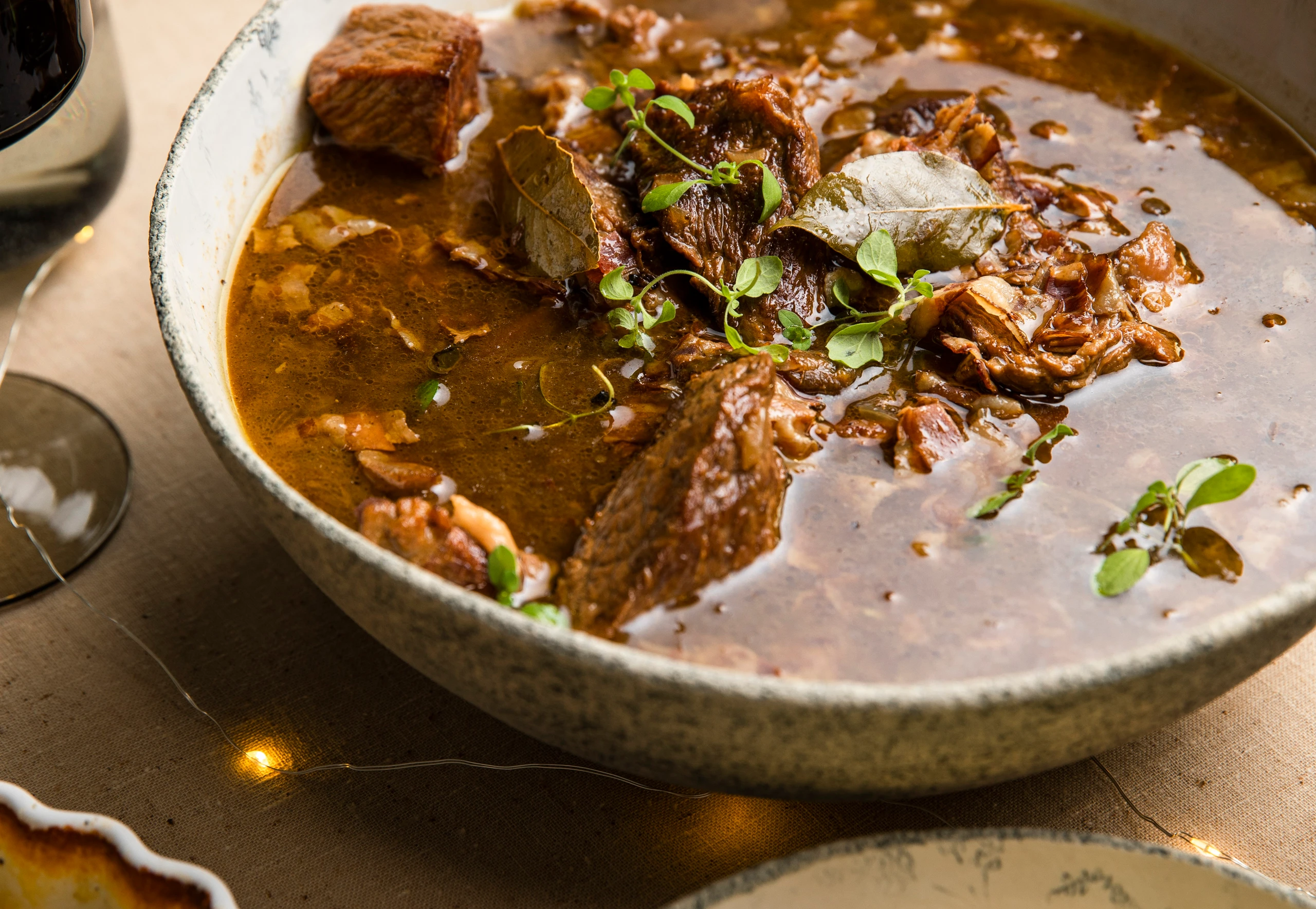 Fleisch in große Stücke schneiden. In Mehl wenden. Übriges Öl in einem Topf erhitzen, Fleisch darin portionsweise braun anbraten. Gesamtes Fleisch zusammen mit Zwiebel- mischung in den Topf geben, mit Guinness und Suppe aufgießen. Zwetschken und Lorbeerblätter zugeben. Eintopf bei schwacher Hitze ca. 2 Stunden schmoren. Mit Salz und Pfeffer abschmecken. Eventuell mit Majoran bestreuen.