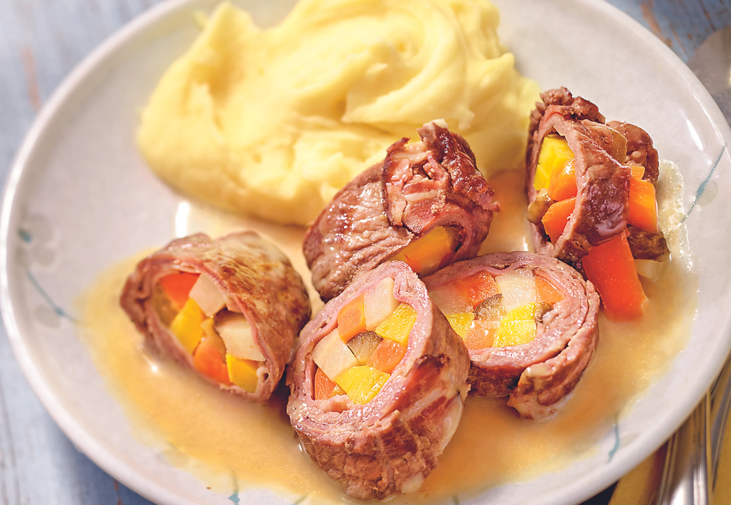 Rouladen aus dem Fond heben und warm stellen. Fond um ein Drittel einkochen. Rahm mit 2 gestr. EL Mehl verquirlen, in den Fond rühren, aufkochen und ca. 3 Minuten köcheln. Sauce mit Salz, Pfeffer und Majoran würzen. Rouladen in die Sauce legen, kurz erwärmen und mit dem Püree servieren.