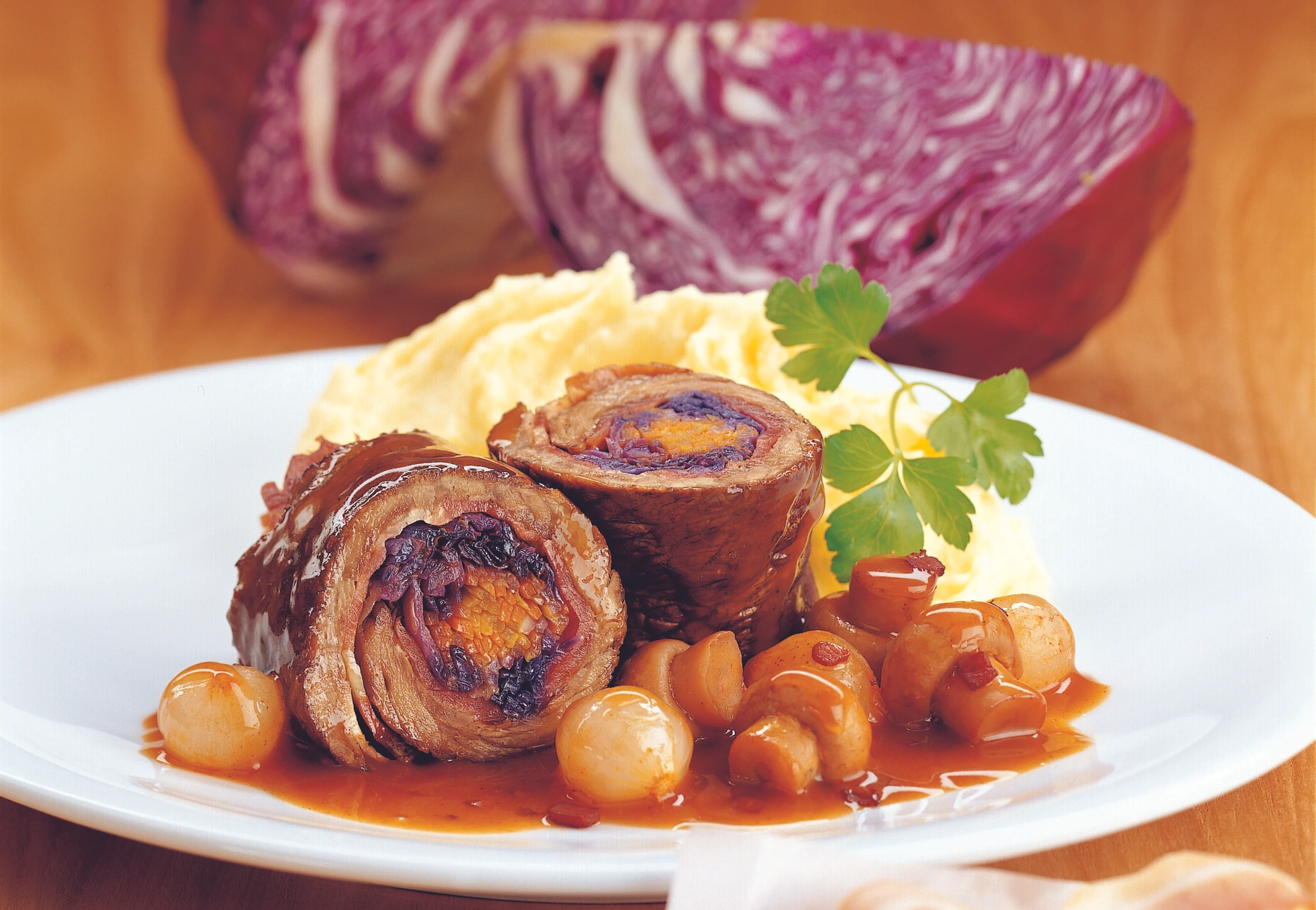 Rindsroulade mit Rotkrautfülle und Gemüsepüree