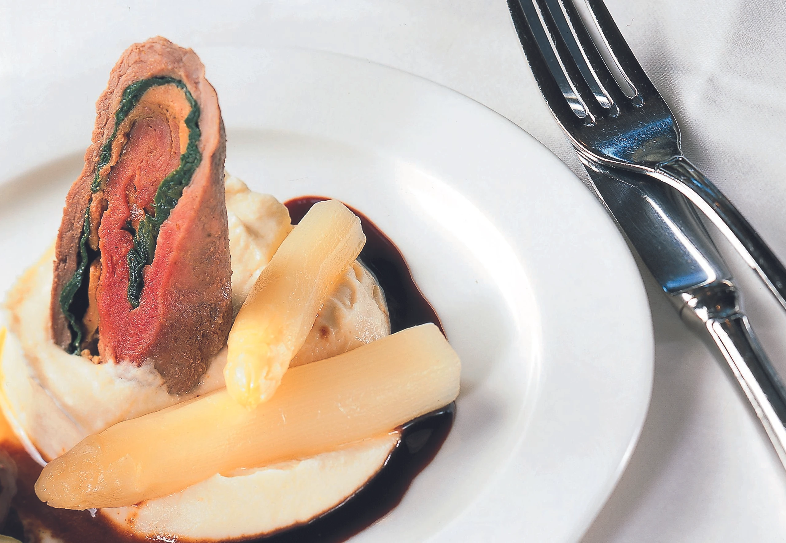 Rouladen auf der Sauce anrichten, mit gekochtem Spargel und Topinamburpüree servieren.