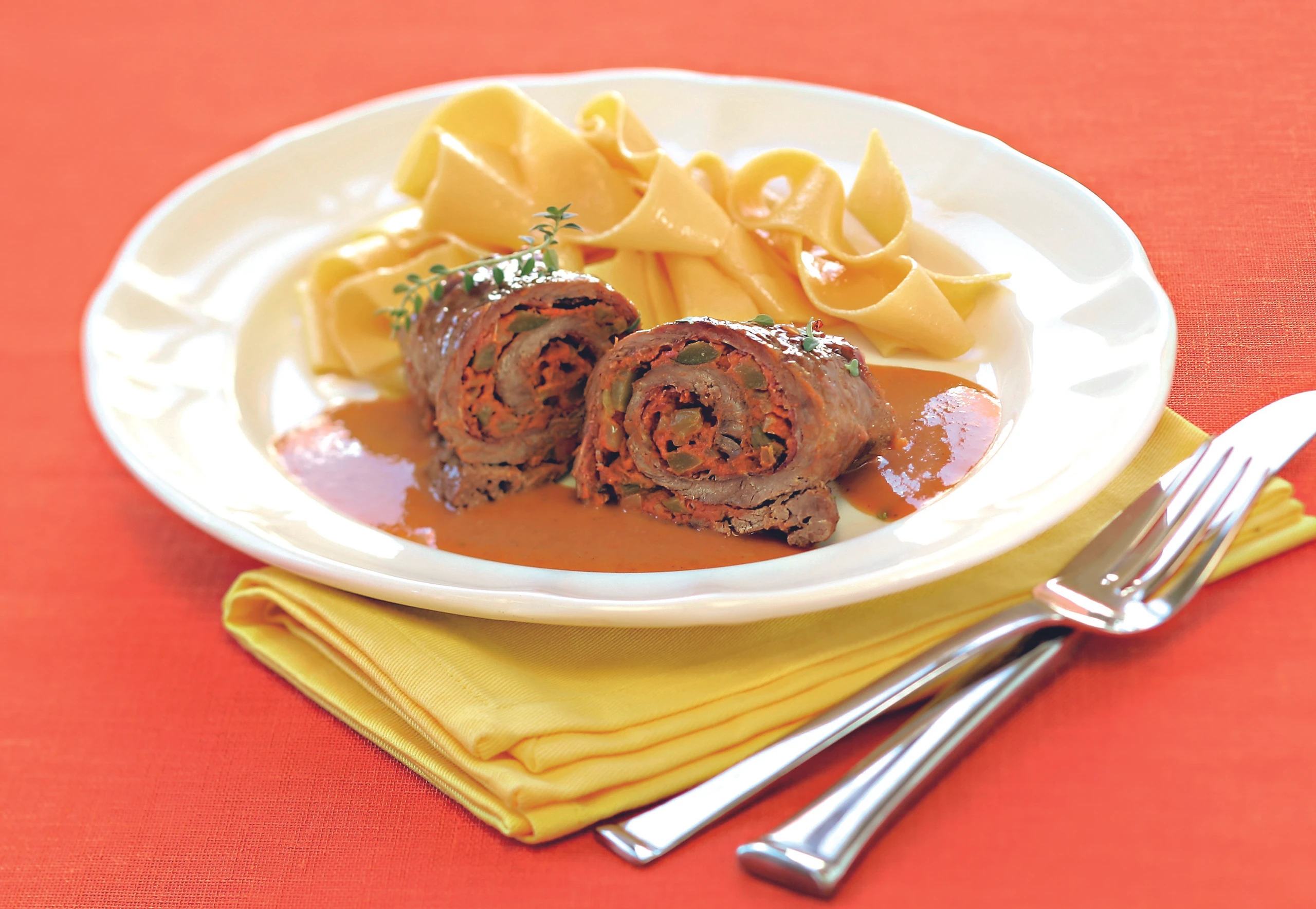 - Schnitzel salzen, pfeffern, mit Speck belegen, mit der Fülle bestreichen und eng einrollen. Mit Zahnstochern fixieren, in 3 EL Öl rundum anbraten und zugedeckt 90 Minuten weich dünsten. Nach und nach Suppe zugießen.