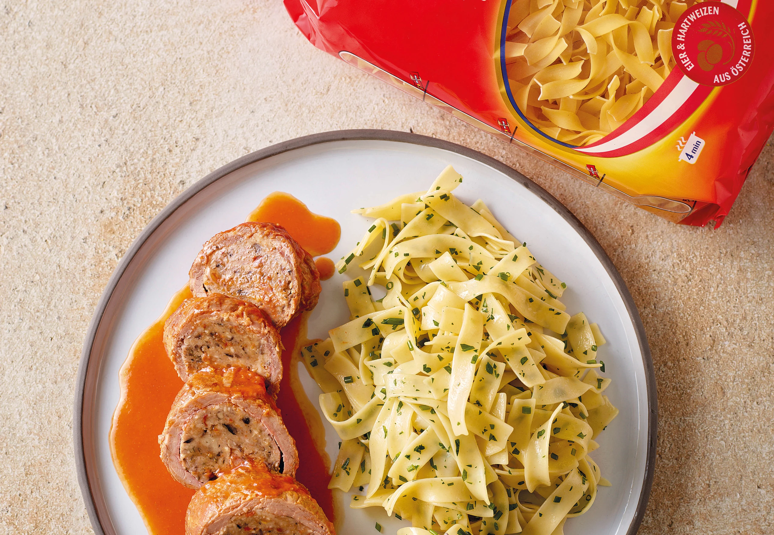 Rindsrouladen mit Paradeissauce und Bandnudeln