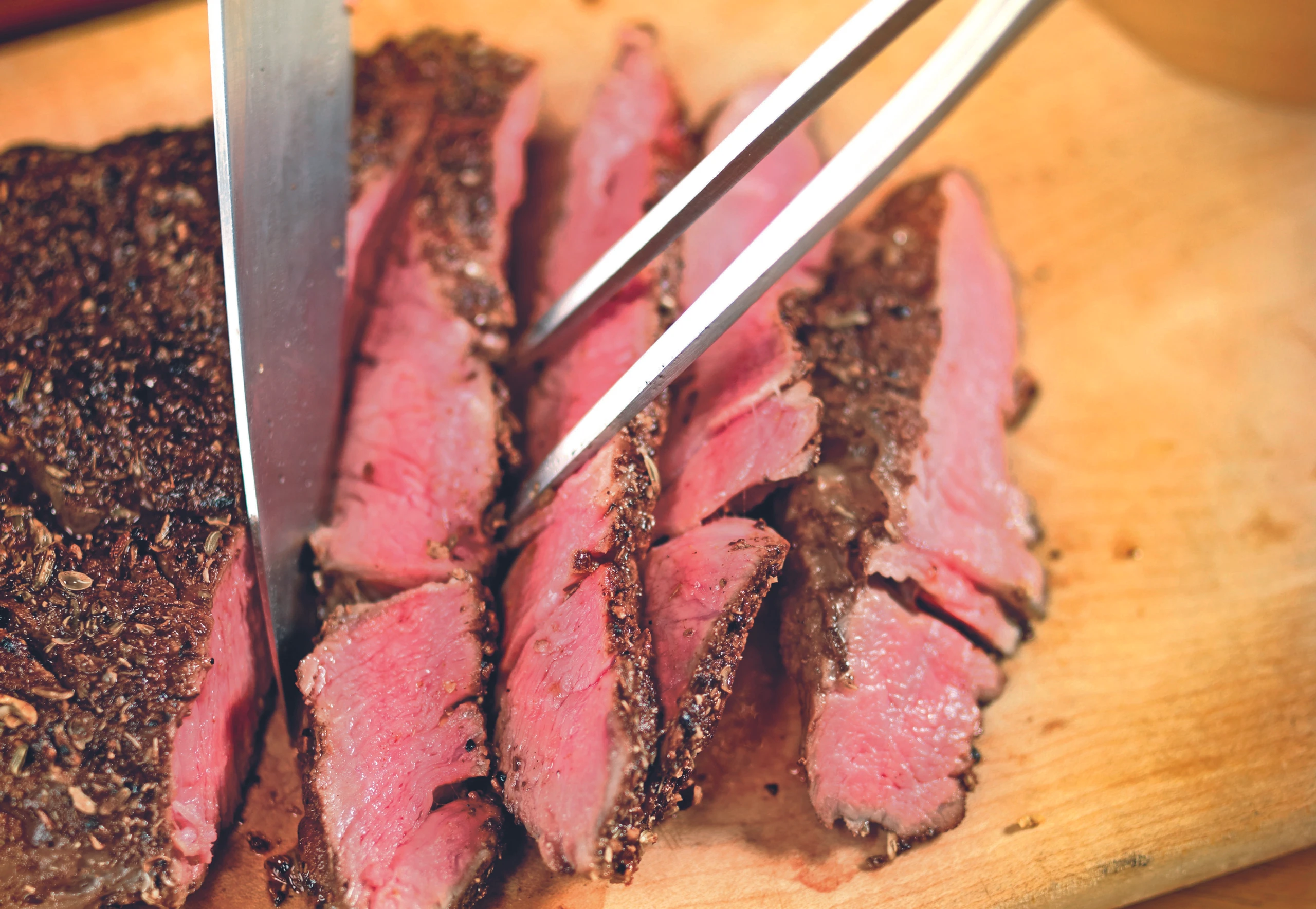 Rohr auf 80°C vorheizen. In einer Pfanne wenig Öl erhitzen, Fleisch darin auf beiden Seiten kurz anbraten und in einen Bräter legen. Bratenthermometer in der dicksten Stelle des Fleisches platzieren. Fleisch im Rohr ca. 1 Stunde bis zu einer Kerntemperatur von 55°C (maximal 60°C) braten.