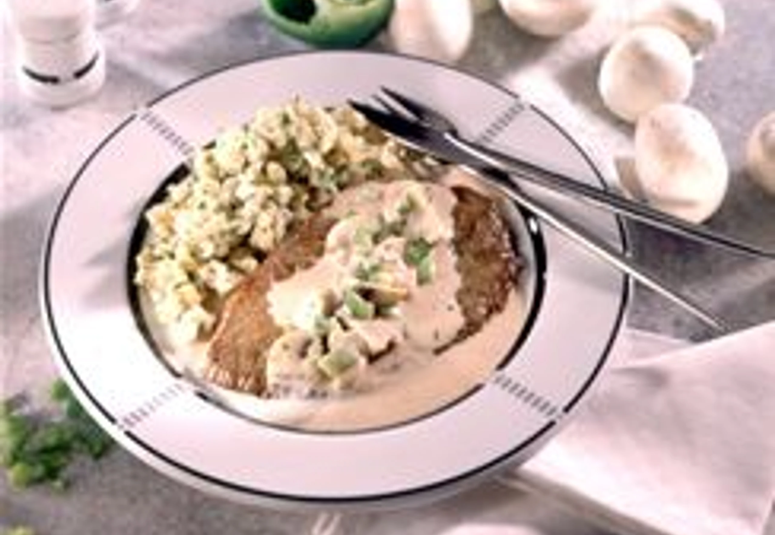 Rindsschnitzel mit Champignonsauce und Kräuterspätzle