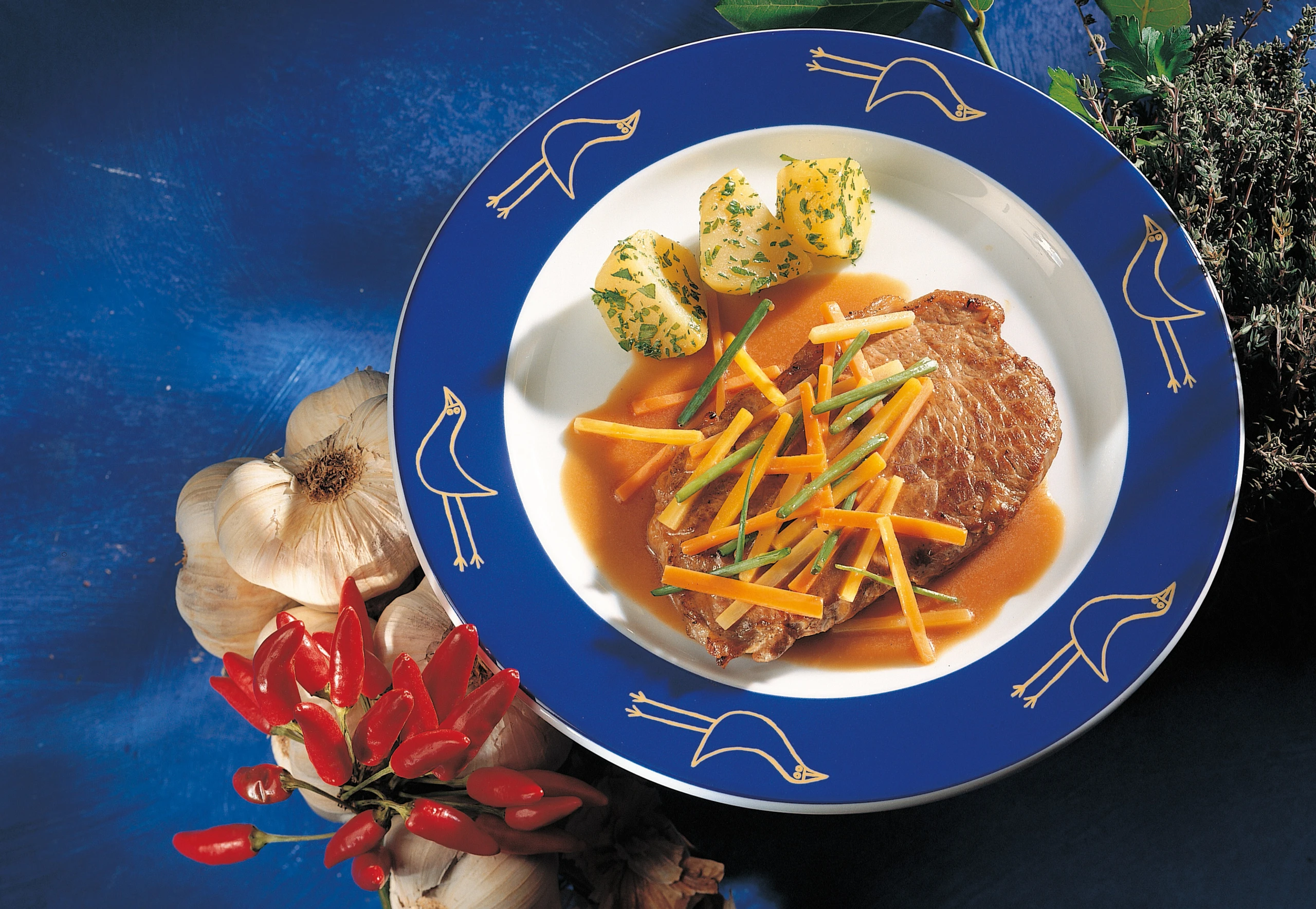 Schnitzel mit der Sauce anrichten und mit Petersilerdäpfeln und Wurzelgemüse als Beilage servieren.