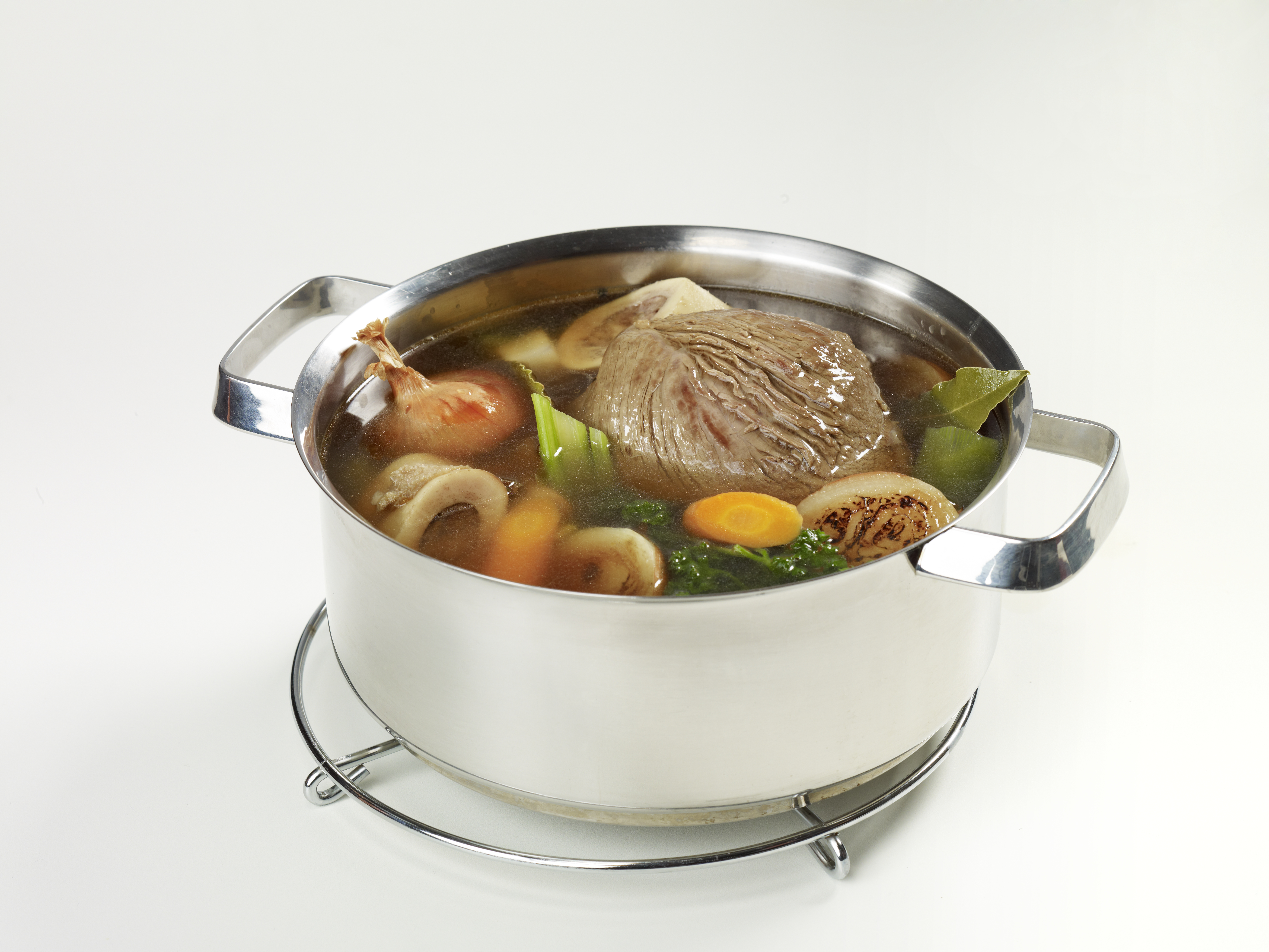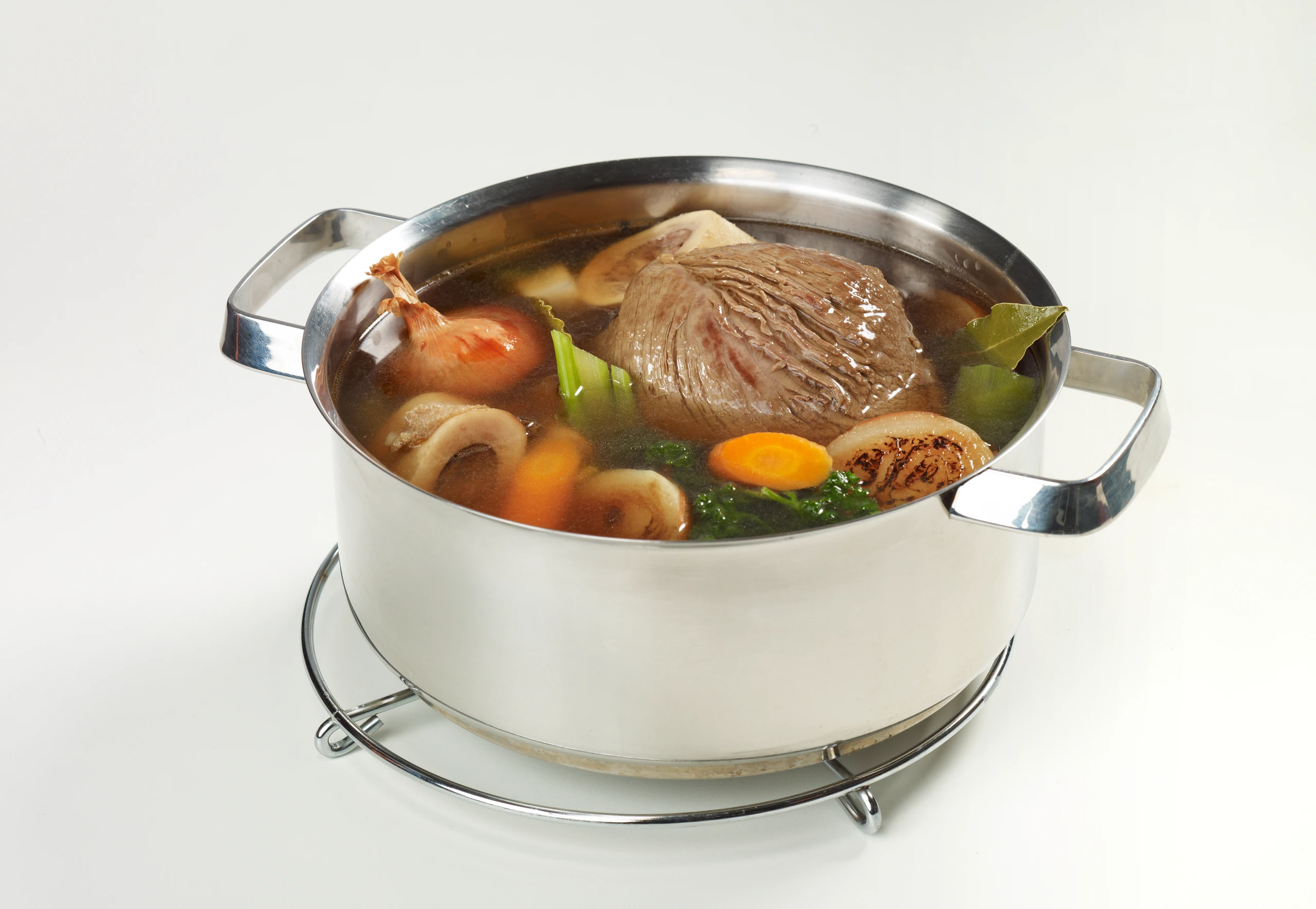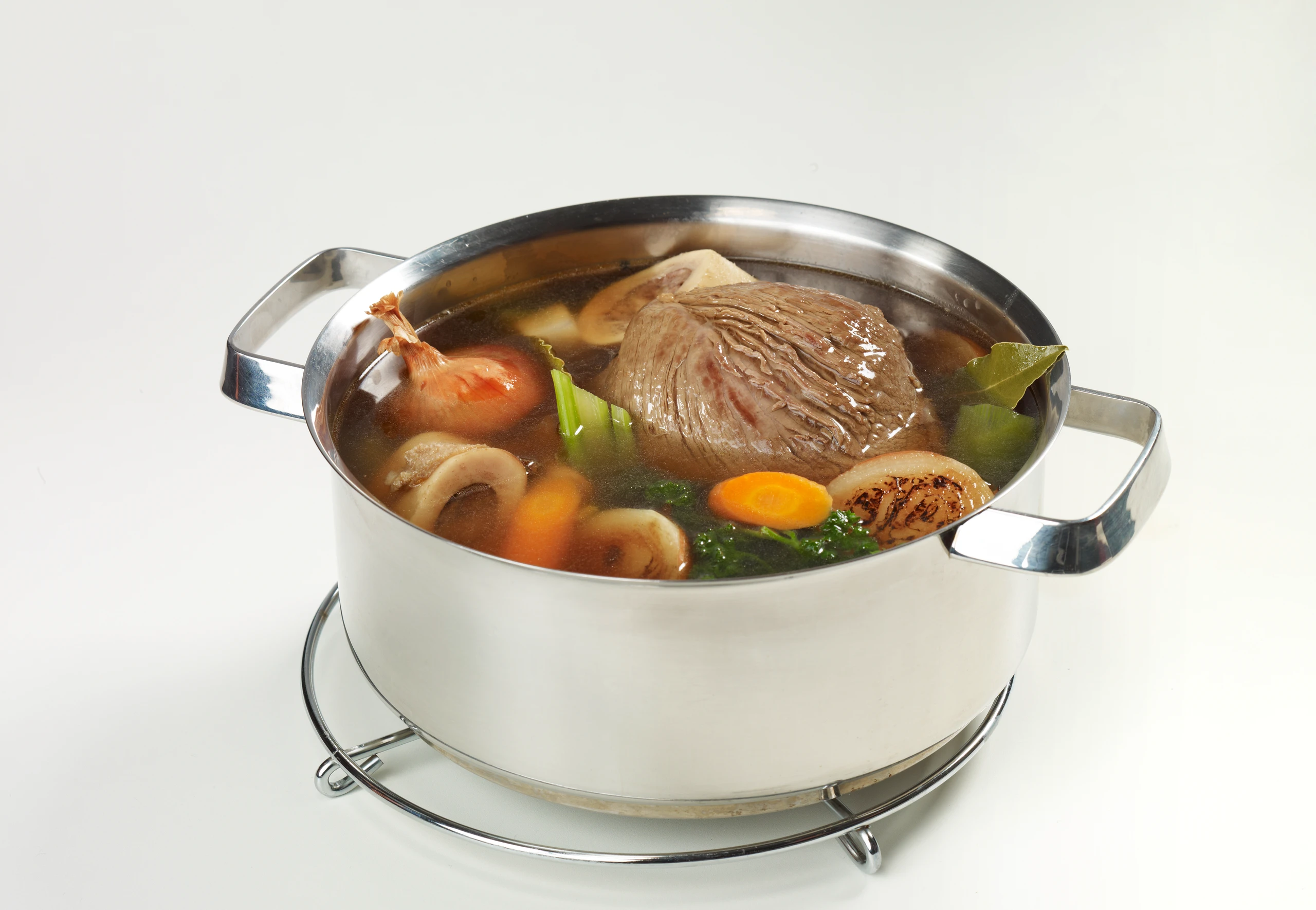 Knochen gut waschen. In einem großen Topf heißes Wasser aufkochen. Knochen einlegen, aufkochen und 2 Minuten köcheln. Knochen abseihen, abschrecken, in einen Topf geben und mit ca. 5 l Wasser gut bedeckt aufgießen. Aufkochen und bei schwacher Hitze 1 Stunde köcheln; dabei den aufsteigenden Schaum immer wieder entfernen.