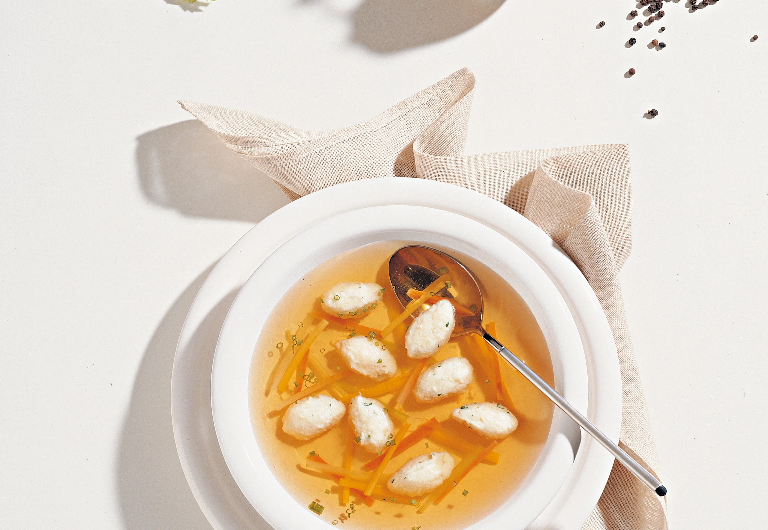 Suppe aufkochen. Aus dem Teig mit einem kleinen Löffel gleichgroße Nockerl formen, in die Suppe legen und schwach wallend ca. 8 Minuten köcheln.