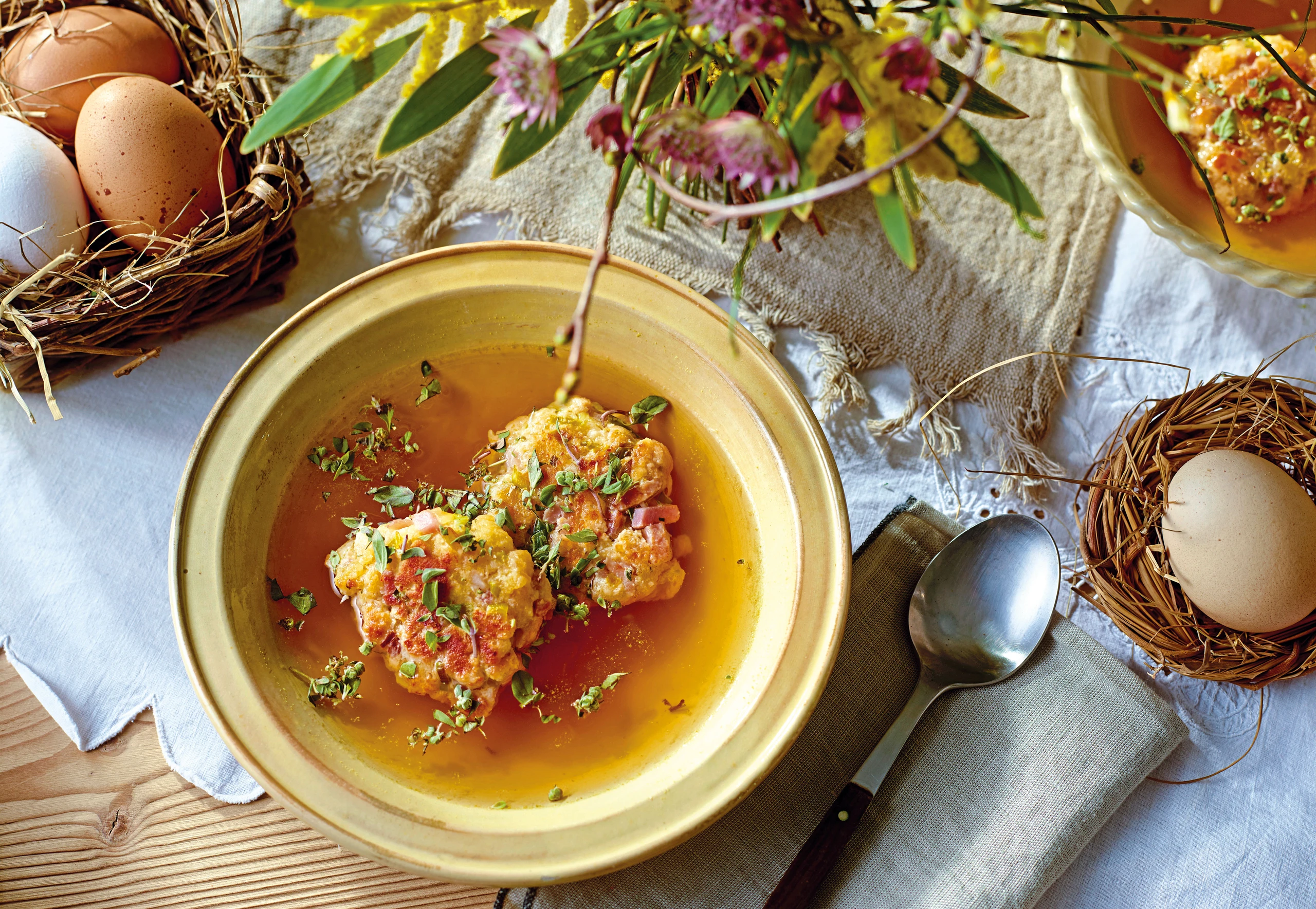 Suppe aufkochen, mit den Laibchen anrichten und mit Majoran bestreut servieren.