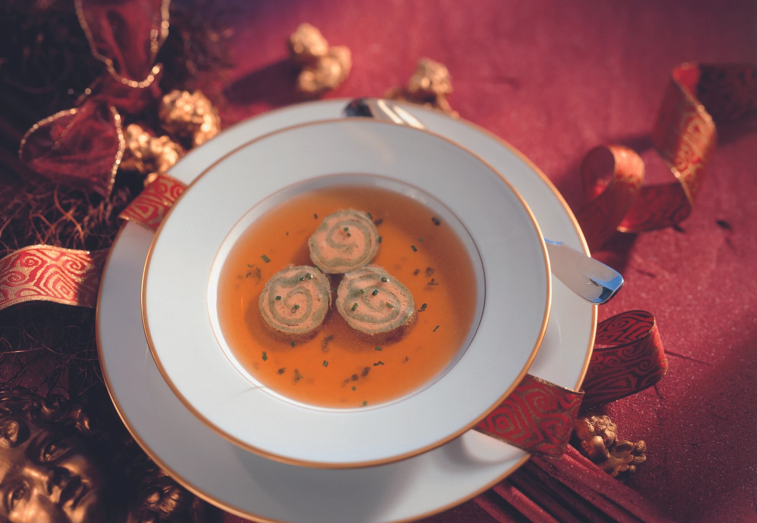 Suppe erhitzen. Rouladen in kaltem Wasser abschrecken, aus der Folie wickeln und in Scheiben schneiden. Schnittlauch fein schneiden, Suppe mit den Rouladenscheiben anrichten, mit Schnittlauch bestreut servieren.
