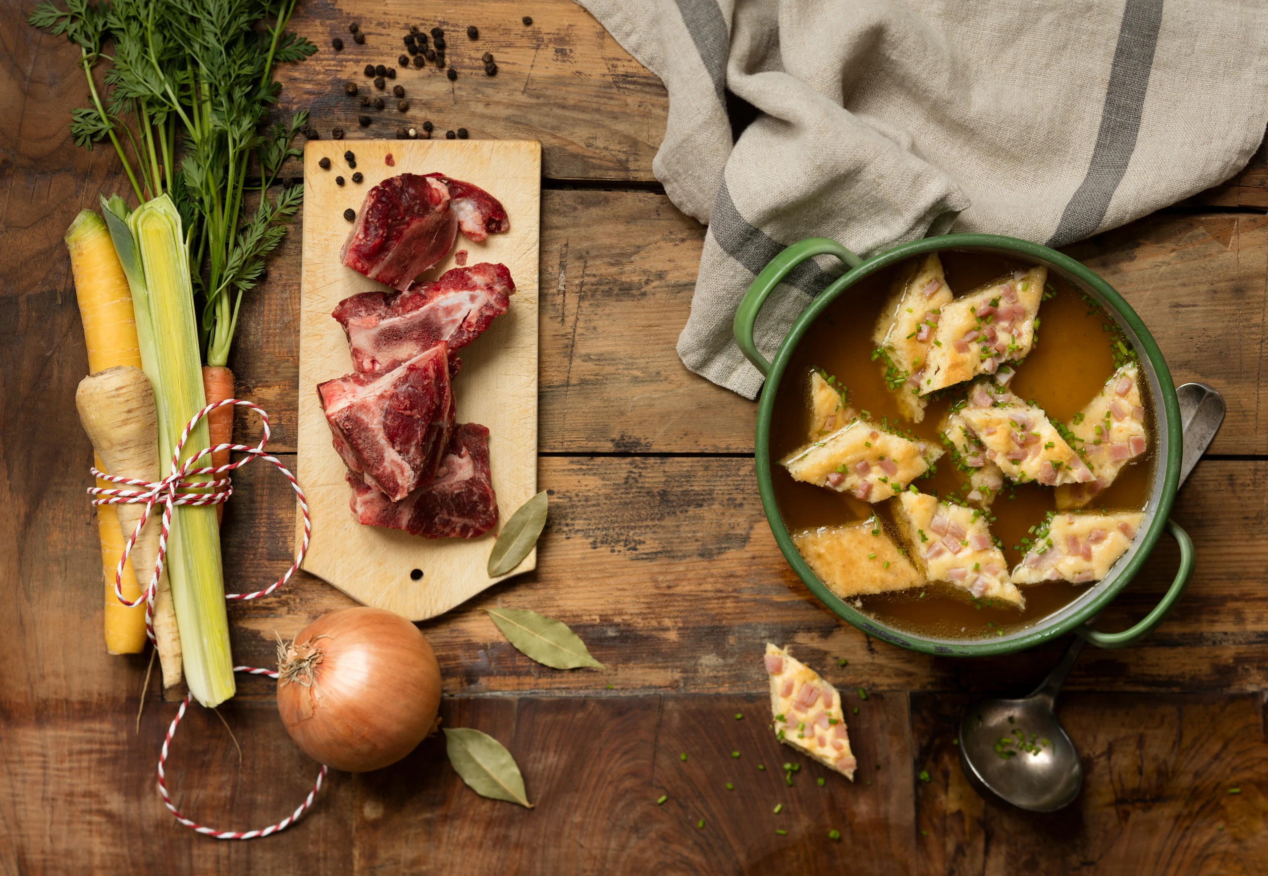 Ca. 4 l Wasser aufkochen, Knochen einlegen und ca. 1 Stunde köcheln. Aufsteigenden Schaum öfters abschöpfen.