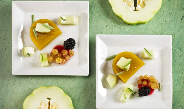Sulz aus der Form stürzen, in Scheiben schneiden und mit den marinierten Gurken anrichten. Mit Beeren, Himbeersauce und Minze garnieren.