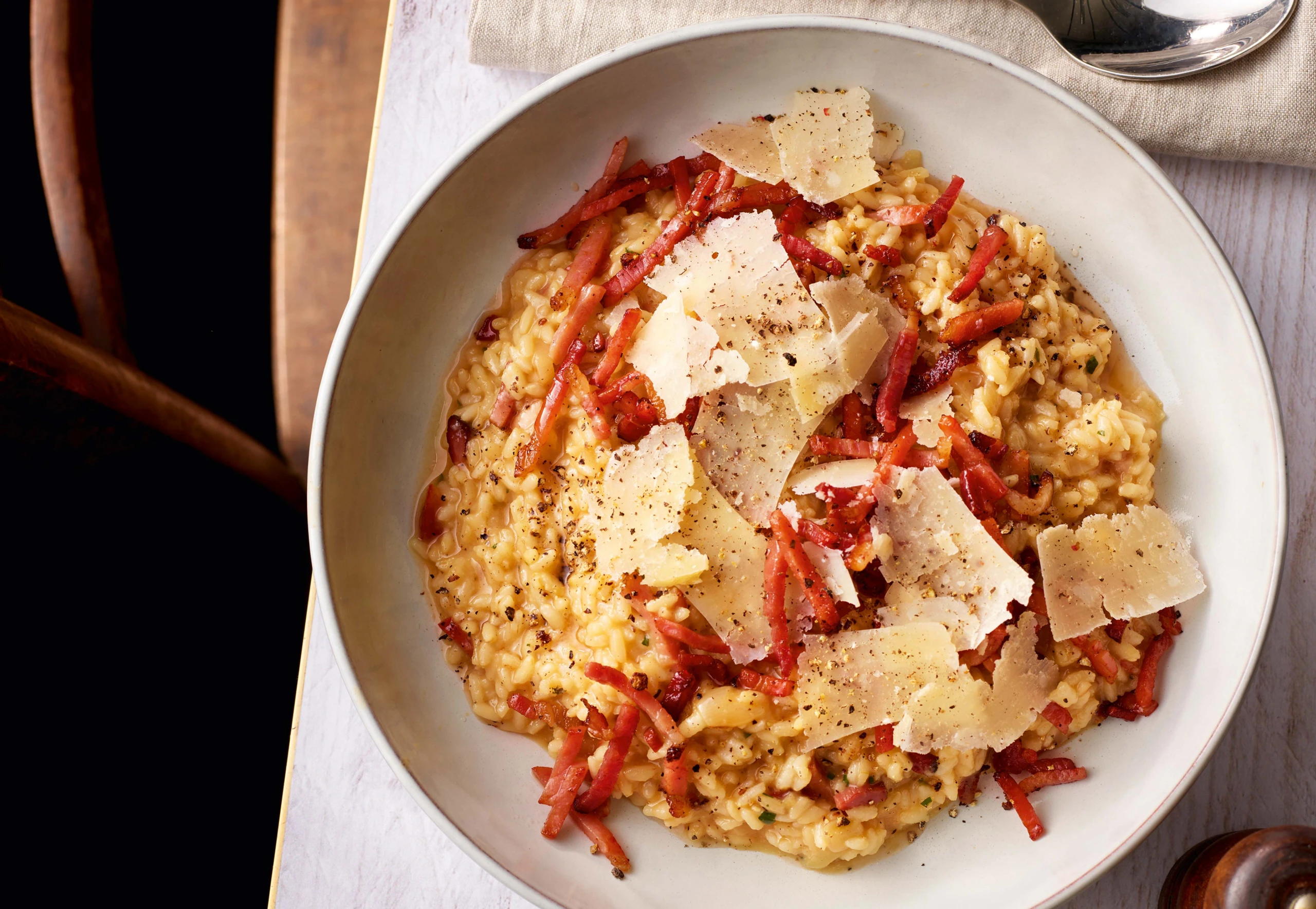 Risotto anrichten, mit restlichem Käse und frisch gemahlenem Pfeffer bestreut servieren.