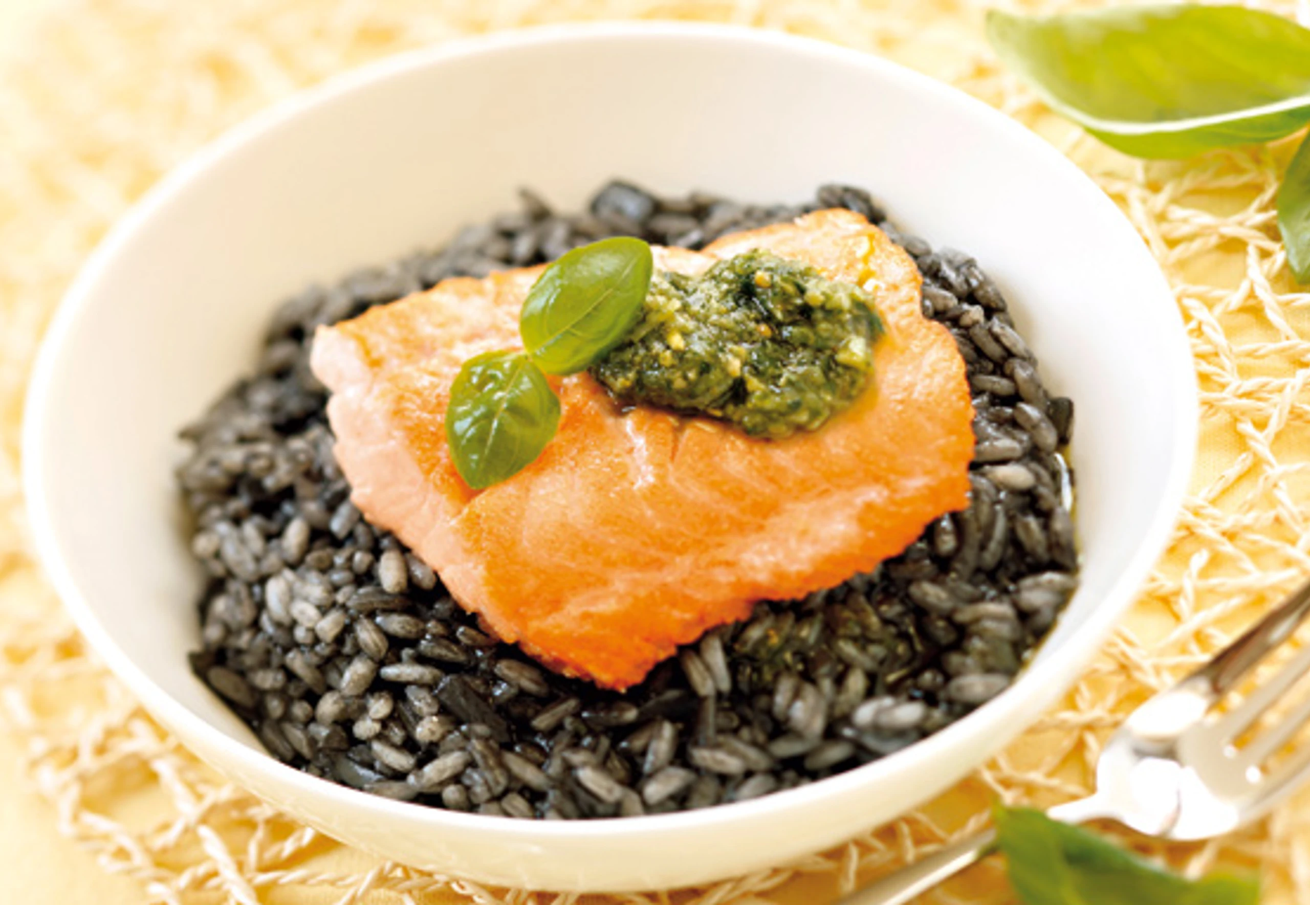 - Das Lachsfilet halbieren, salzen und pfeffern und im Olivenöl beidseitig braten (insgesamt ca. 2 Minuten). Risotto mit dem Lachs anrichten, mit Pesto und Basilikum garniert servieren.