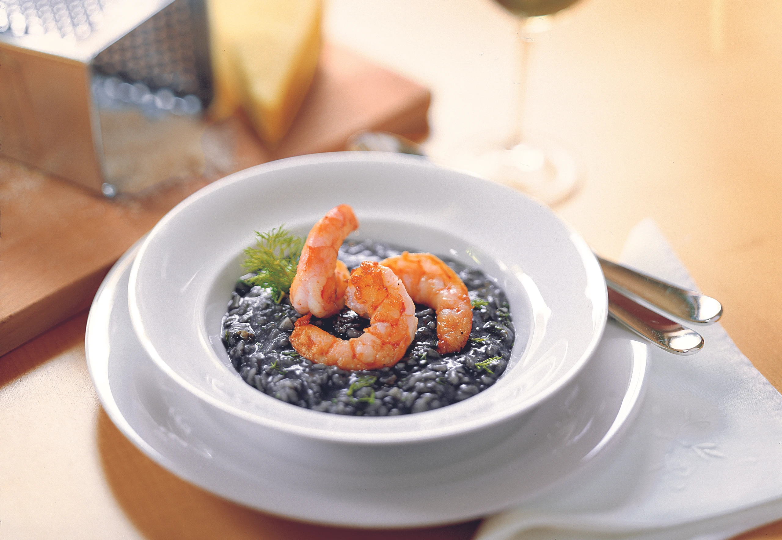 Reis einstreuen und glasig anschwitzen. Wein zugießen und aufkochen. Reis unter Rühren kochen, bis die Flüssigkeit verdampft ist. Suppe nach und nach immer dann zugießen, wenn die Flüssigkeit verdampft ist – Sepiatinte nach dem ersten Suppenaufguss einrühren. Reis unter Rühren weiterköcheln. Kochzeit insgesamt ca. 30 Minuten.