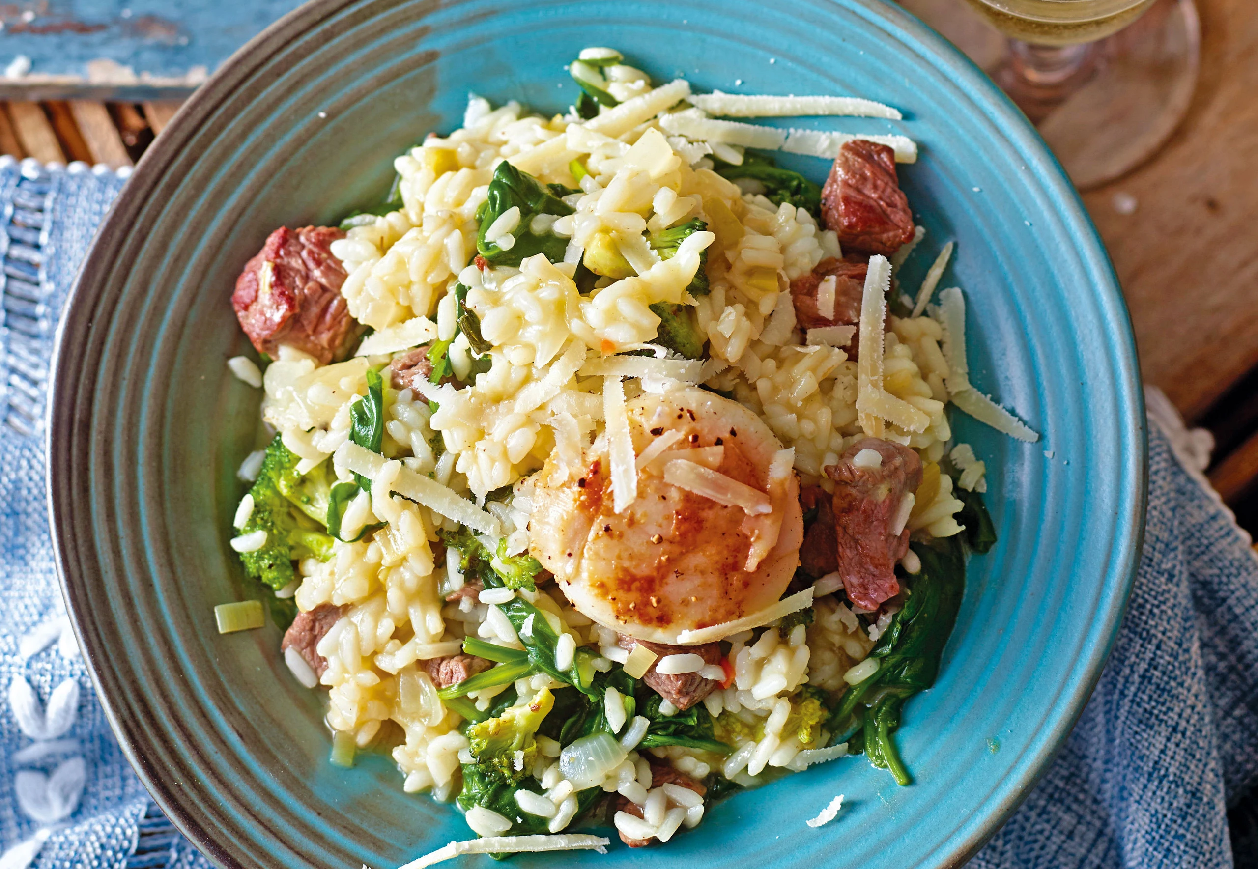 Fleisch salzen, pfeffern. In einer beschichteten Pfanne die Hälfte des Öls erhitzen und das Fleisch darin scharf anbraten, umfüllen und warm stellen. Im Bratrückstand Brokkoli bissfest braten. Parallel dazu in einer zweiten Pfanne übriges Öl erhitzen und die Muscheln darin beidseitig braten. Salzen und pfeffern. Die Hälfte vom Parmesan, Brokkoli und Spinat in das Risotto rühren und kurz ziehen lassen. Risotto mit Fleisch und Jakobsmuscheln anrichten, mit übrigem Parmesan bestreut servieren.