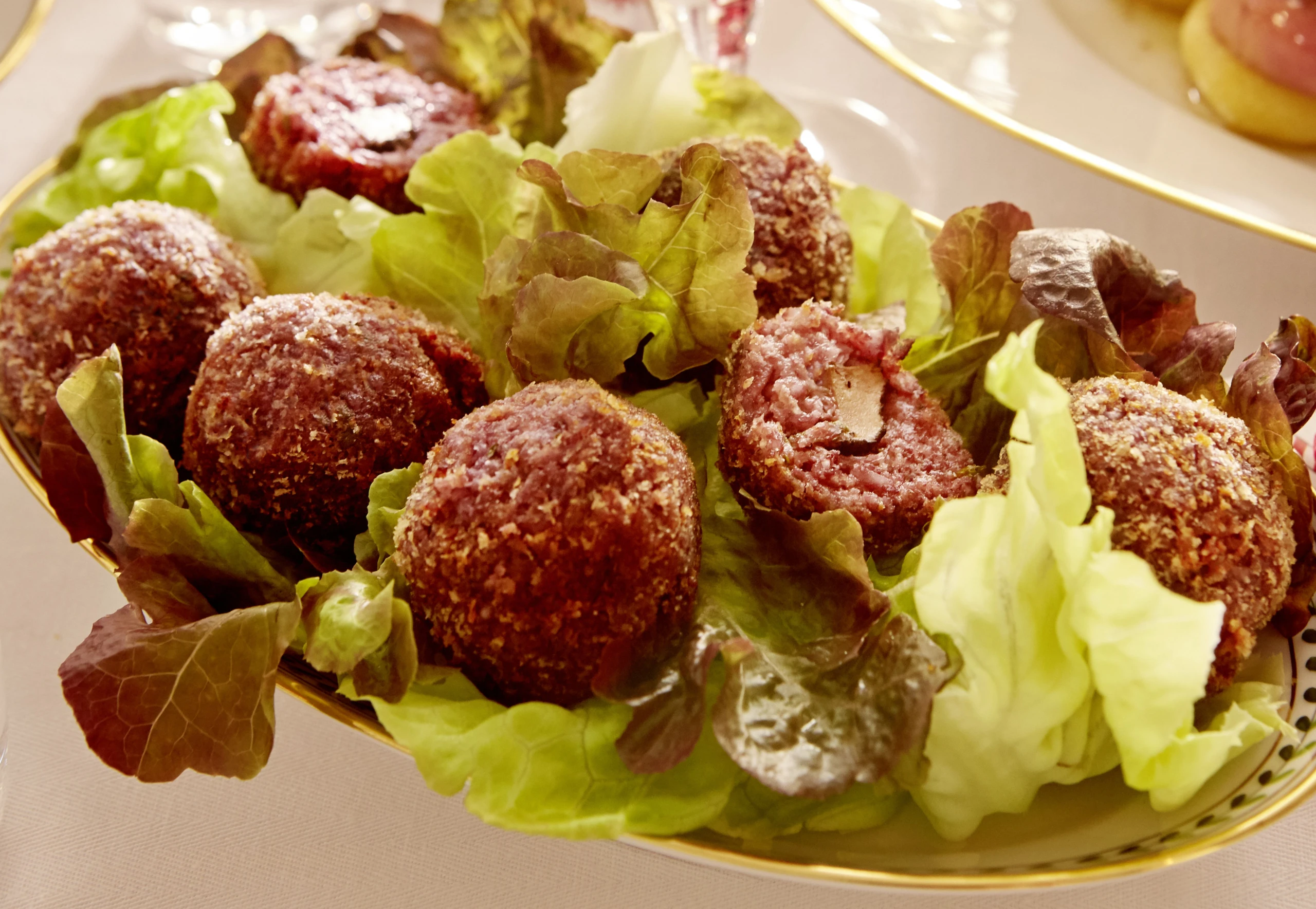 Ca. 3 Finger hoch Öl erhitzen und die Bällchen darin goldbraun backen. Mit einem Gitterlöffel herausheben und auf Küchenpapier abtropfen lassen. Salate mit der Marinade vermischen. Bällchen mit dem Salat anrichten.