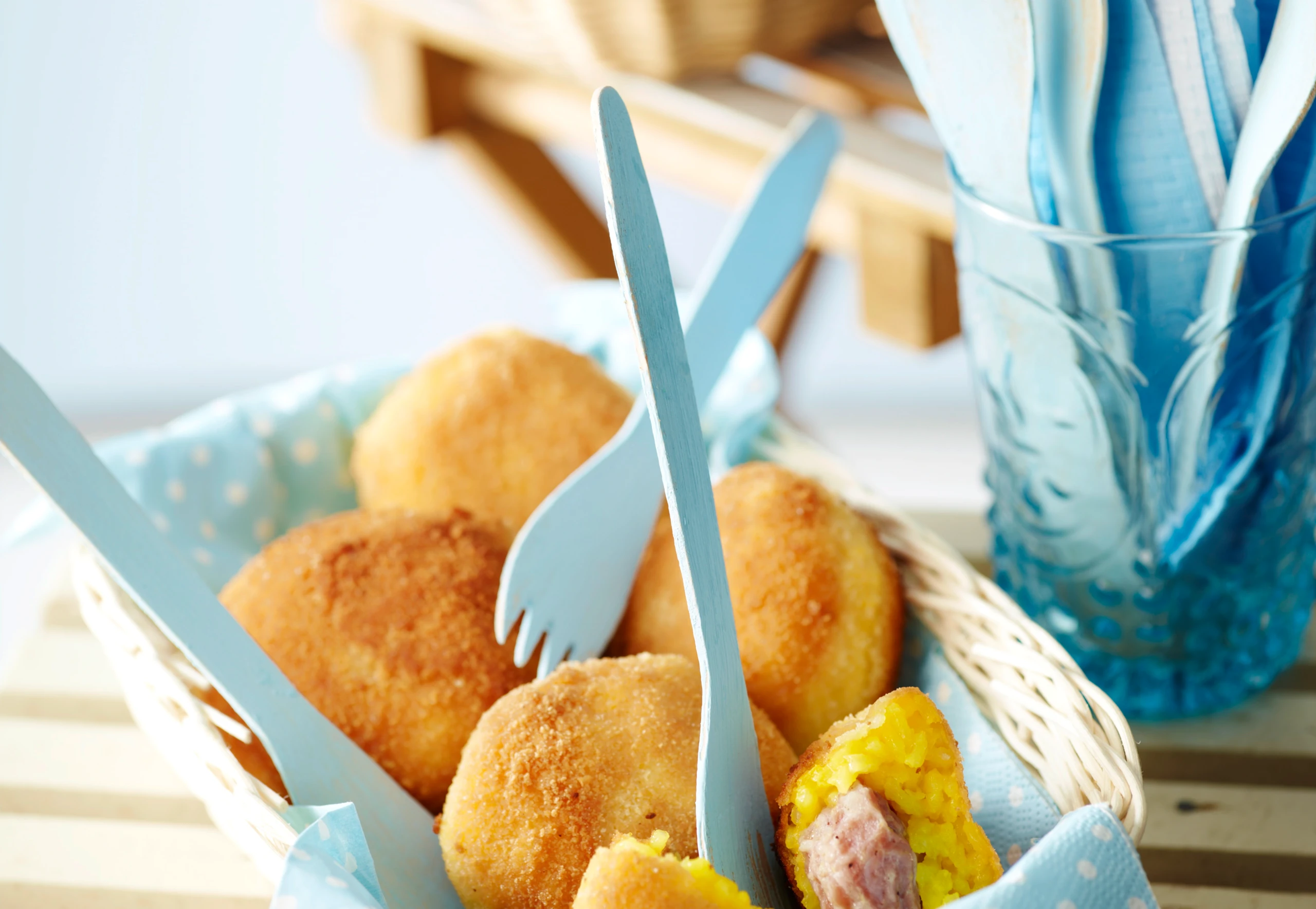 - Reis, Suppe und Safran aufkochen. Reis zugedeckt bei schwacher Hitze ca. 30 Minuten quellen lassen. Parmesan und Butter untermischen, Masse auskühlen lassen.