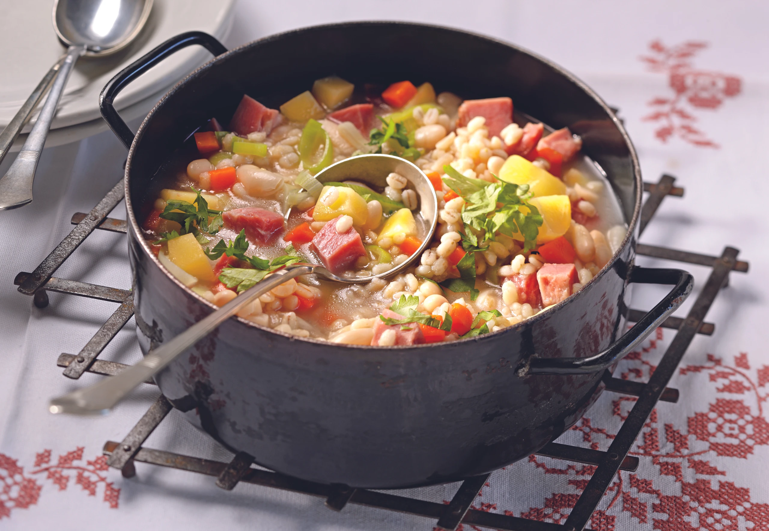 Gemüse kurz vor Ende der Garzeit zur Rollgerste geben und bissfest kochen. Zuletzt das Fleisch untermengen. Ritschert mit Salz, Pfeffer und Majoran abschmecken.