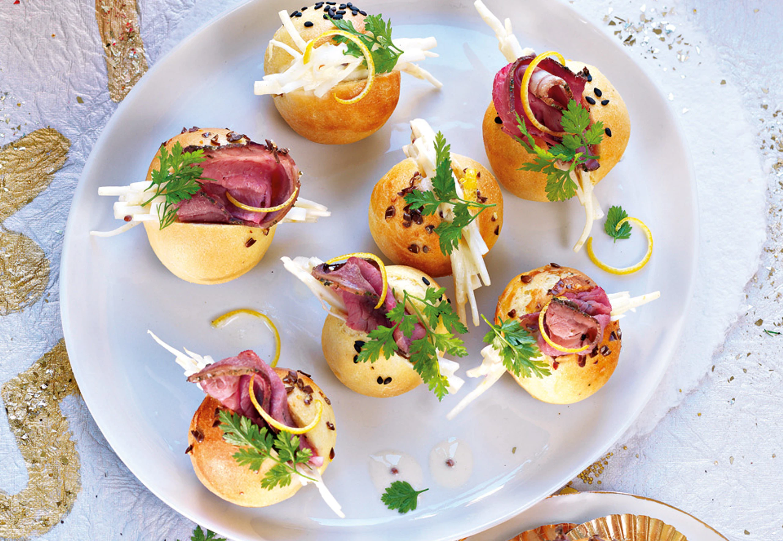 Brioches in der Mitte einschneiden, mit Remoulade und einer halben Scheibe Roastbeef füllen, mit Kerbel und Zitronenzesten garnieren.