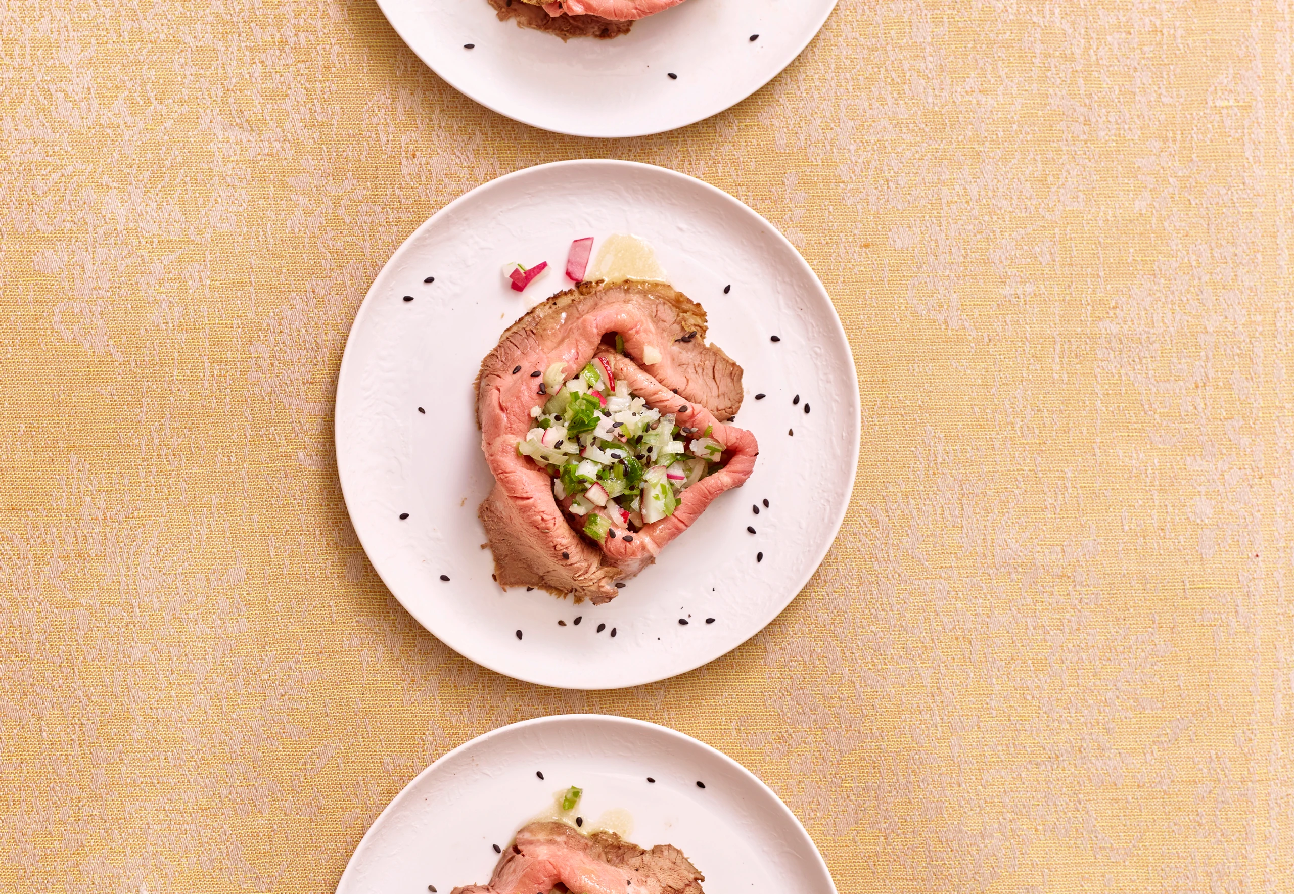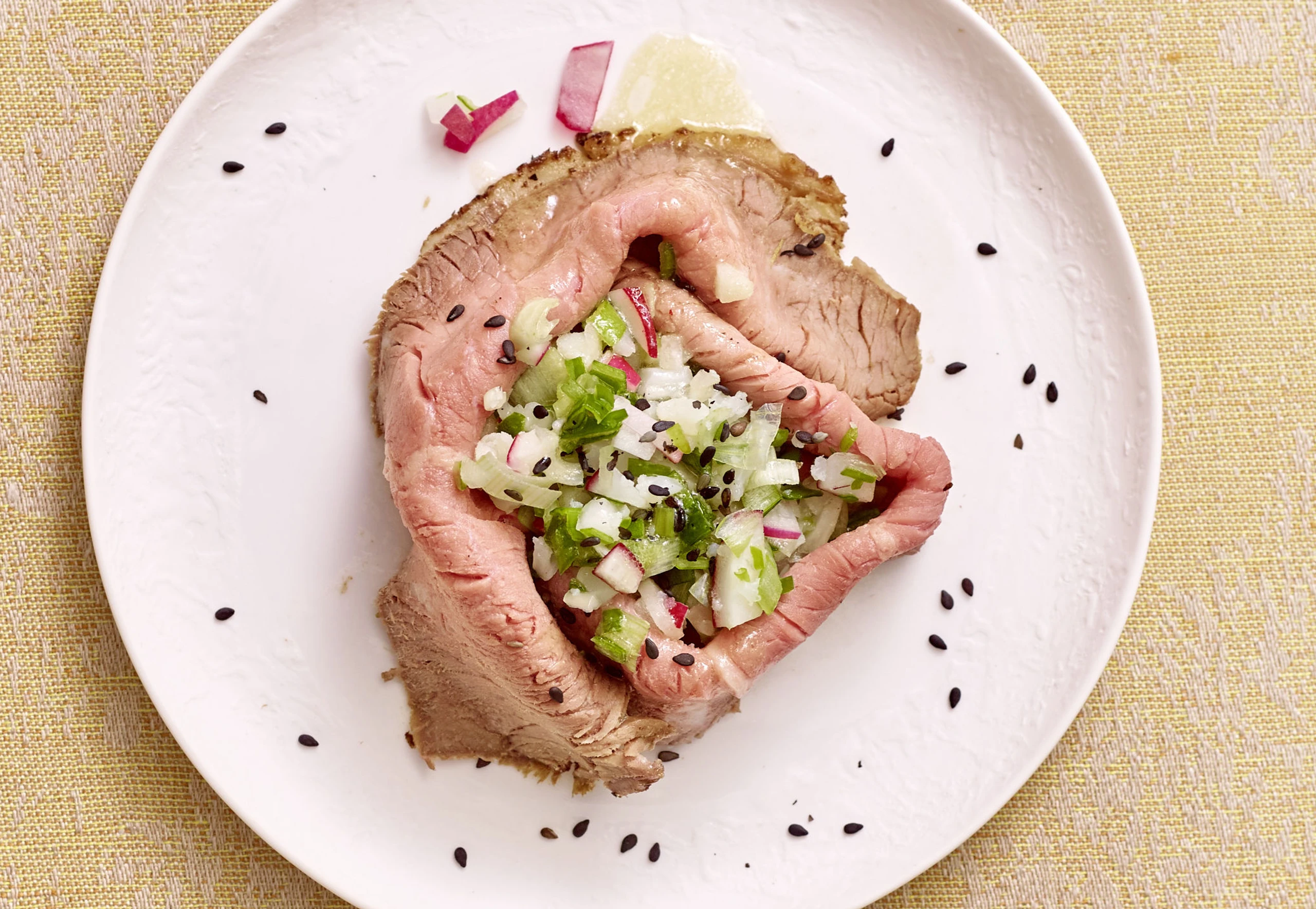 Je 3 Roastbeefscheiben kreisförmig auflegen, Gemüse in die Mitte setzen, mit der Marinade beträufeln, mit Sesam bestreuen.