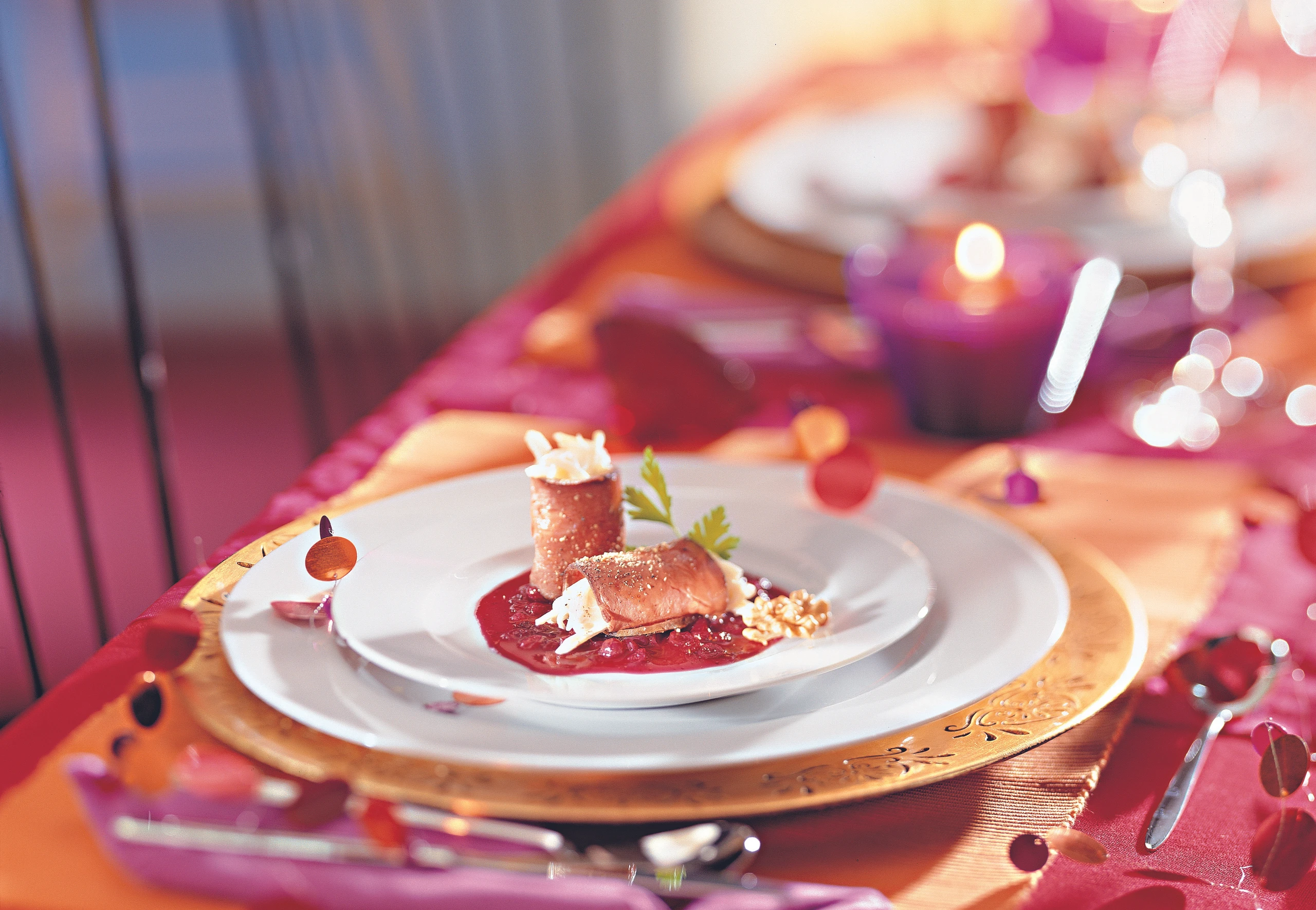 Roastbeef auflegen, am unteren Rand mit Fülle belegen und eng einrollen. Röllchen mit Öl bestreichen, pfeffern, auf dem Gelee anrichten, mit Petersilie und übrigen Nüssen garnieren.