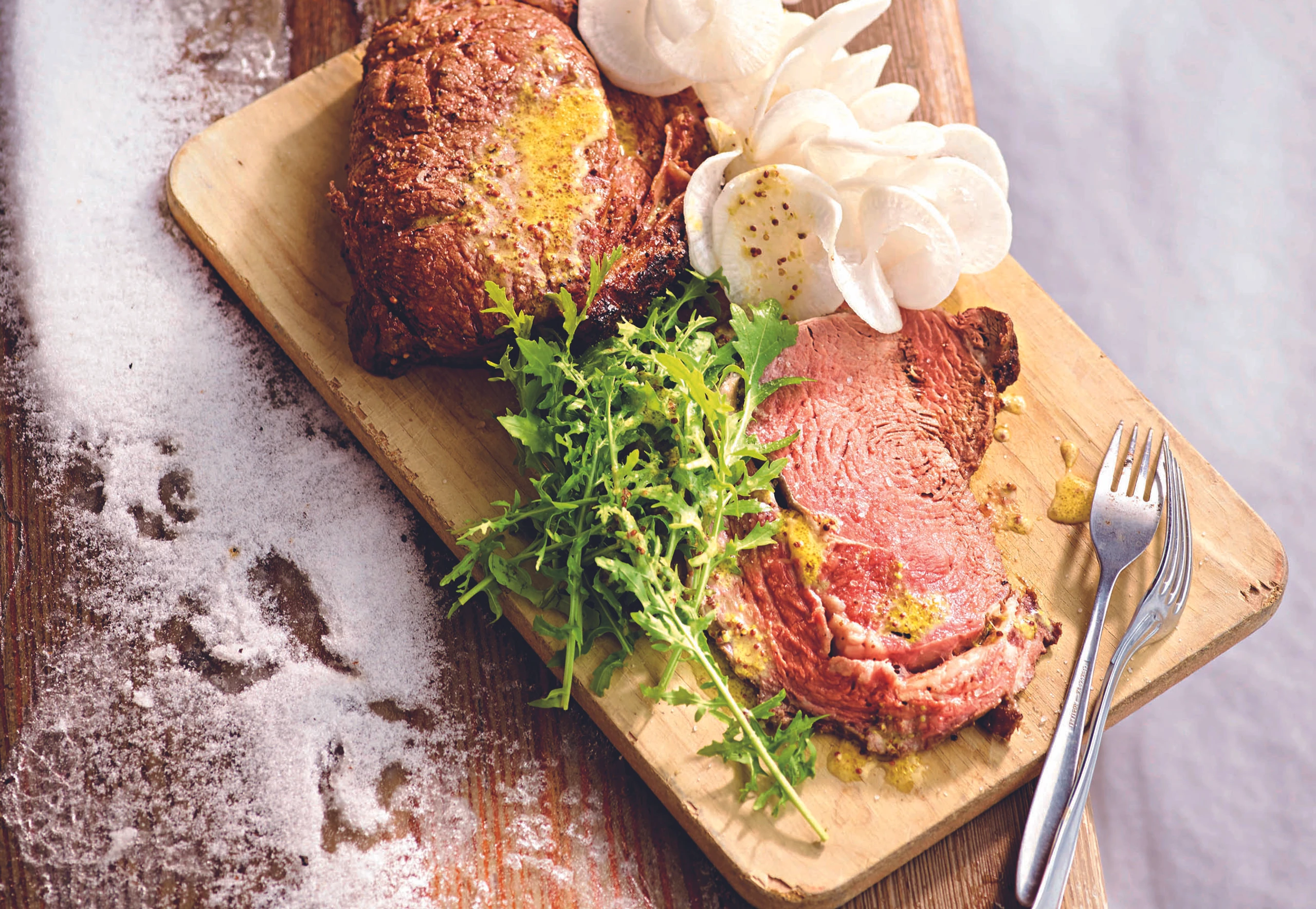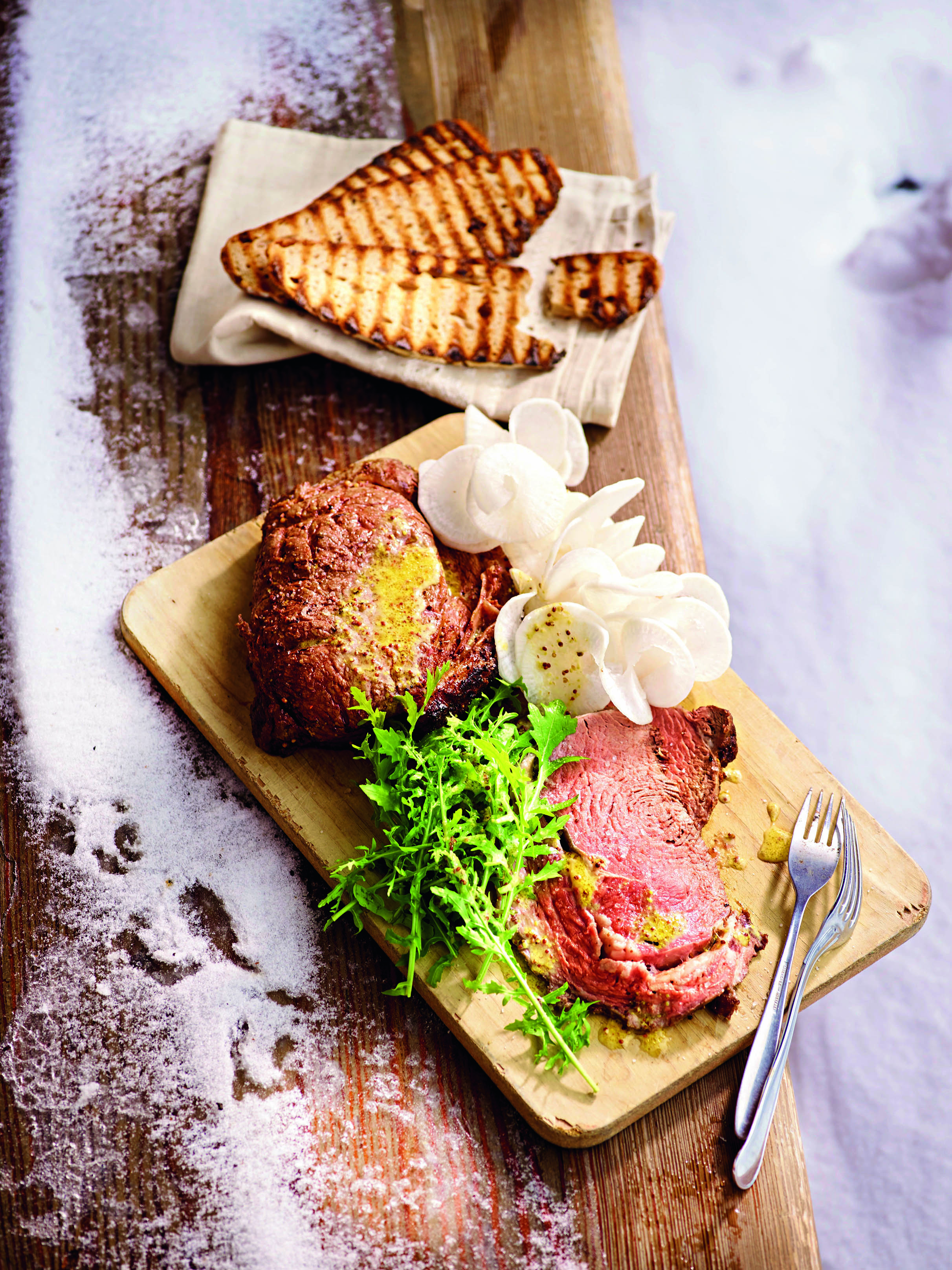 Fleisch in dünne Scheiben schneiden, salzen, pfeffern und mit Senfmarinade, Rettich, Rucola und Broten anrichten.
